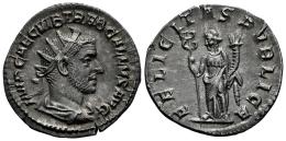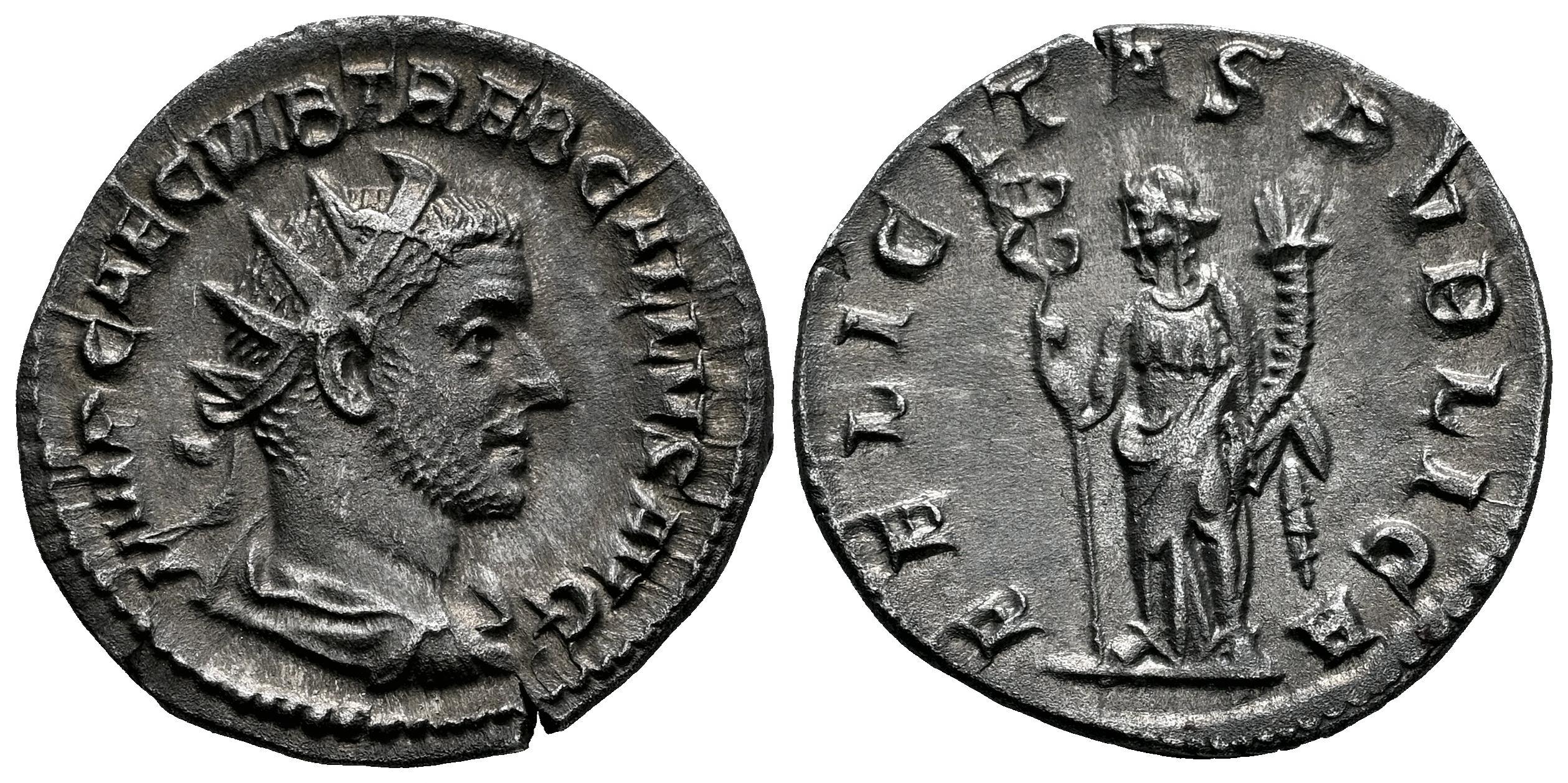 Treboniano Galo. Antoniniano. 251-253 d.C. Roma. (Ric-IV 33). (Rsc-37). Anv.: IMP CAE C VIB TREB GALLVS AVG. Busto radiado, drapeado y con coraza a la derecha. Rev.: FELICITAS PVBLICA. Felicitas en pie de frente, mirando hacia la izquierda, sosteniendo largos caduceos y cornucopias. Ag. 3,00 g. Suave pátina. Atractiva. MBC+. Est...70,00.