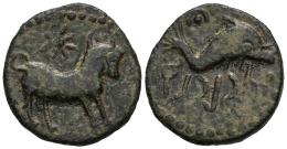 Asido. Semis. 50 a.C. Medina Sidonia (Cádiz). (Abh-158). (MIB-17/02). (Acip-915). Anv.: Toro a derecha, encima estrella. Rev.: Delfín a derecha, creciente y punto, caduceo y leyenda libio fenicia. Ae. 6,06 g. MBC/MBC+. Est...120,00.
