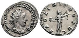Valeriano I. Antoniniano. 253 d.C. Roma. (Ric-V 1 74). (MIR-44d). (Rsc-25). Anv.: IMP C P LIC VALERIANVS AVG. Busto radiado, drapeado y con coraza a la derecha. Rev.: APOLINI PROPVG. Apolo en pie a la derecha, tensando arco. Ve. 3,16 g. Ex Áureo & Calicó 378 (14/12/2021), lote 2187. MBC+. Est...60,00.