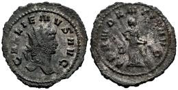 Galieno. Antoniniano. 260-268 d.C. Roma. (Ric-V 1 157). (MIR-574a). (C-5). Anv.: GALLIENVS AVG. Cabeza radiada a la derecha. Rev.: ABVNDANTIA AVG. Abundantia en pie hacia la derecha, vaciando cornucopias; B en el campo izquierdo. Ae. 3,89 g.  Restos de plateado original. Bonito anverso. EBC-/MBC+. Est...30,00.