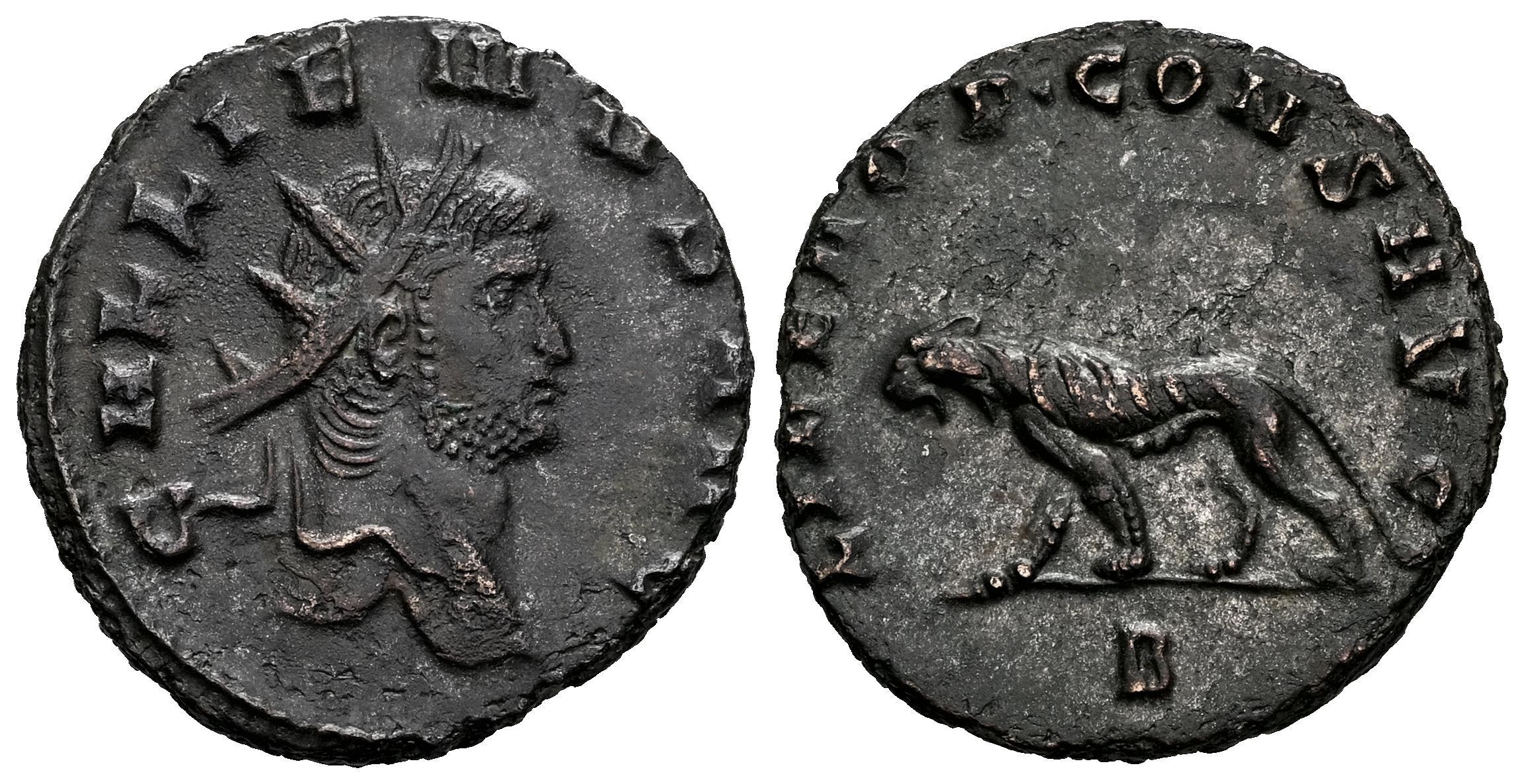 Galieno. Antoniniano. 267-268 d.C. Roma. (Ric-V 1 230). (MIR-713b). (Rsc-586). Anv.: GALLIENVS AVG. Cabeza radiada hacia la derecha. Rev.: LIBERO·P·CONS AVG. Pantera avanzando hacia la derecha; B en exergo. Ve. 3,17 g. Ex Monedalia 5 (16/06/2021), lote 20. MBC+/EBC. Est...60,00.