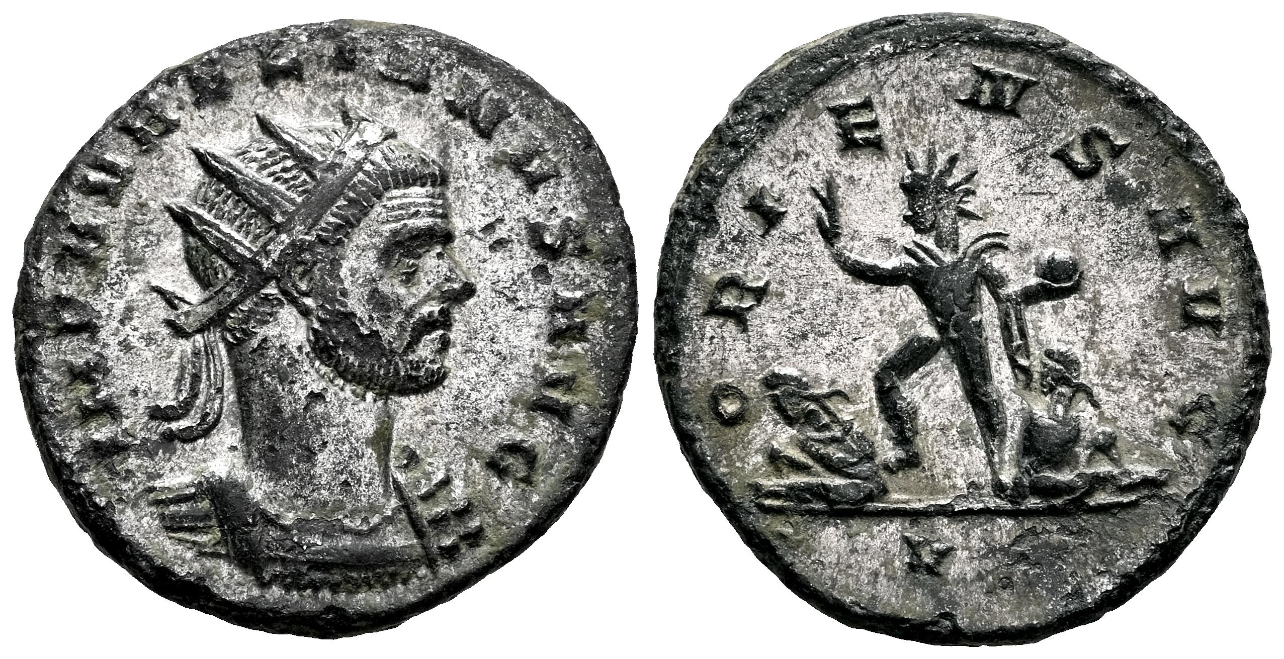 Aureliano. Antoniniano. 274 d.C. Siscia. (Ric-V 1 254). Anv.: IMP AVRELIANVS AVG. Busto radiado y con coraza a la derecha. Rev.: ORIENS AVG. Sol en pie a la izquierda, levantando la mano y sosteniendo un globo; dos cautivos sentados a la izquierda y a la derecha a sus pies, V en exergo. Ve. 4,67 g. MBC+. Est...50,00.