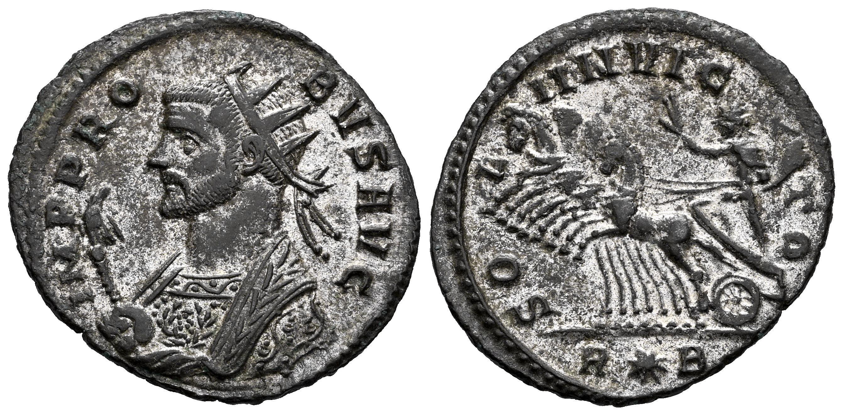 Probo. Antoniniano. 276-282 d.C. Roma. (Ric-V 2 202). (C-644). Anv.: IMP PROBVS AVG. Busto radiado a la izquierda, con manto imperial y sosteniendo un cetro rematado por un águila. Rev.: SOLI INVICTO. Sol cabalgando hacia la izquierda sobre una cuadriga, sosteniendo globo y látigo; R (estrella) B en exergo. Ve. 3,17 g. Ex Monedalia 3 (28/05/2020), lote 184. MBC+. Est...65,00.