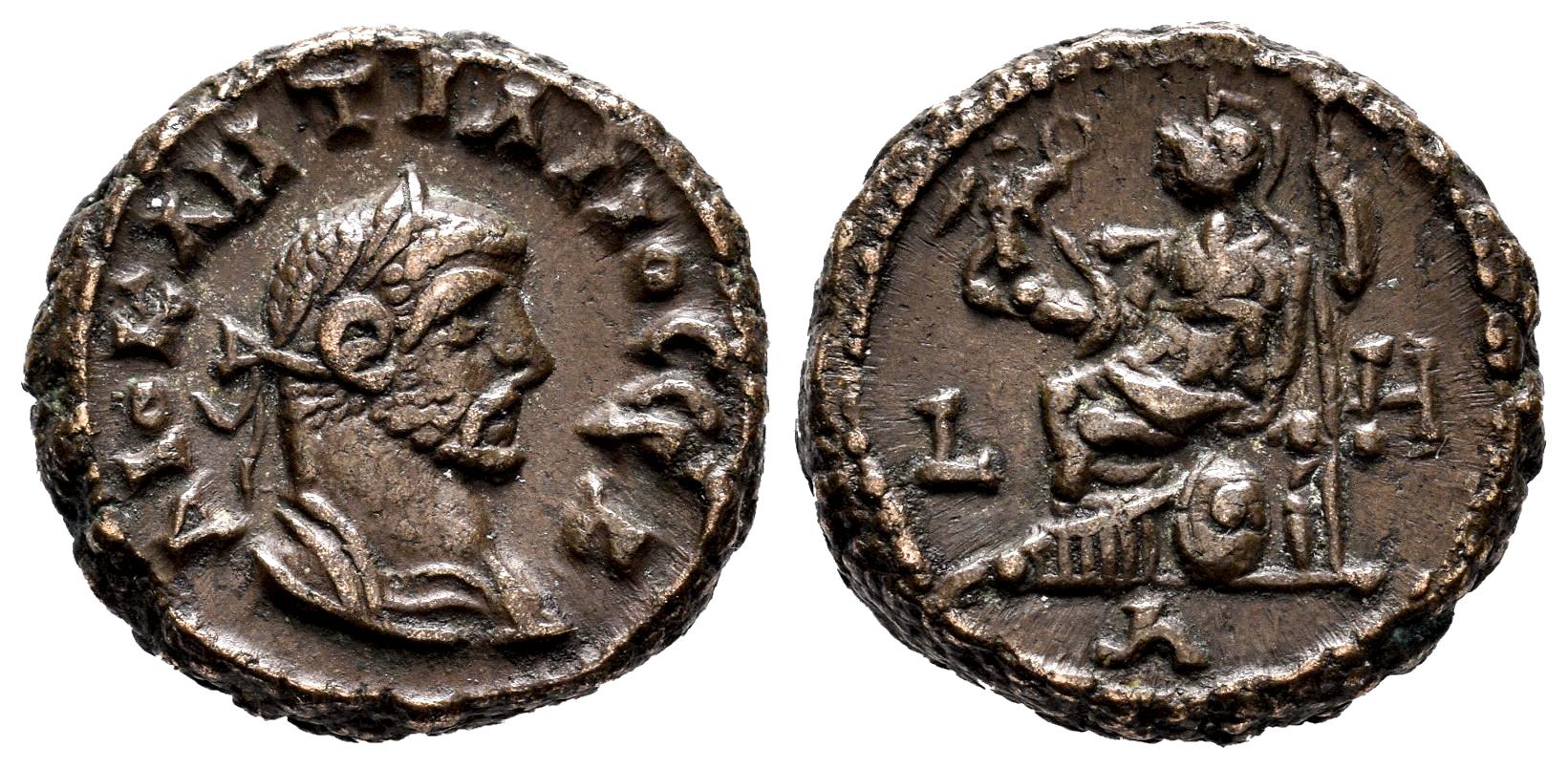 Diocleciano. Tetradracma. RY 8 = 291/2 d.C. Alejandría. Egipto. (Emmett-4032). (Dattari (Savio)-5641). Anv.: ΔΙΟΚΛΗΤΙΑΝΟϹ ϹЄΒ. Cabeza laureada a la derecha. Rev.: Atenea sedente a la izquierda sobre un escudo, sosteniendo una lanza y Niké en la mano extendida; de izq. a der. (fecha) a través de los campos. Ve. 8,61 g. MBC+. Est...60,00.