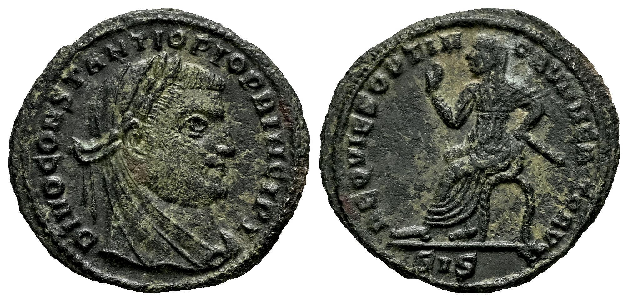 Constancio I. AE 16. 305-306 d.C. Siscia. (Ric-42). Anv.: DIVO CONSTANTIO PIO PRINCIPI. Busto laureado, velado y drapeado a la derecha. Rev.: REQUIES OPTIMORVM MERITORVM. Emperador, velado, sentado a la izquierda en una silla curul, sosteniendo un cetro y levantando la mano; SIS en el exergo. Ae. 1,34 g. MBC+. Est...30,00.