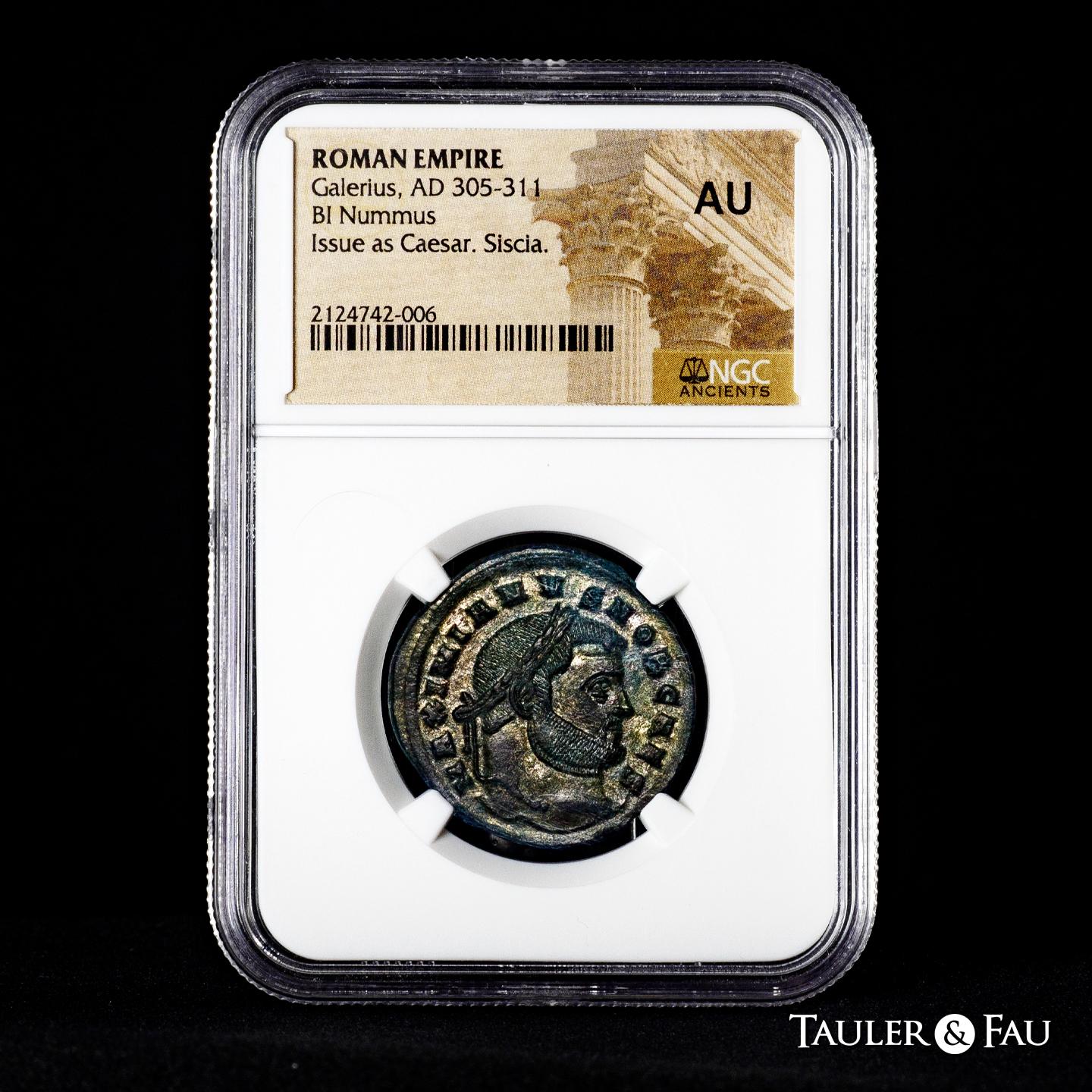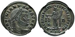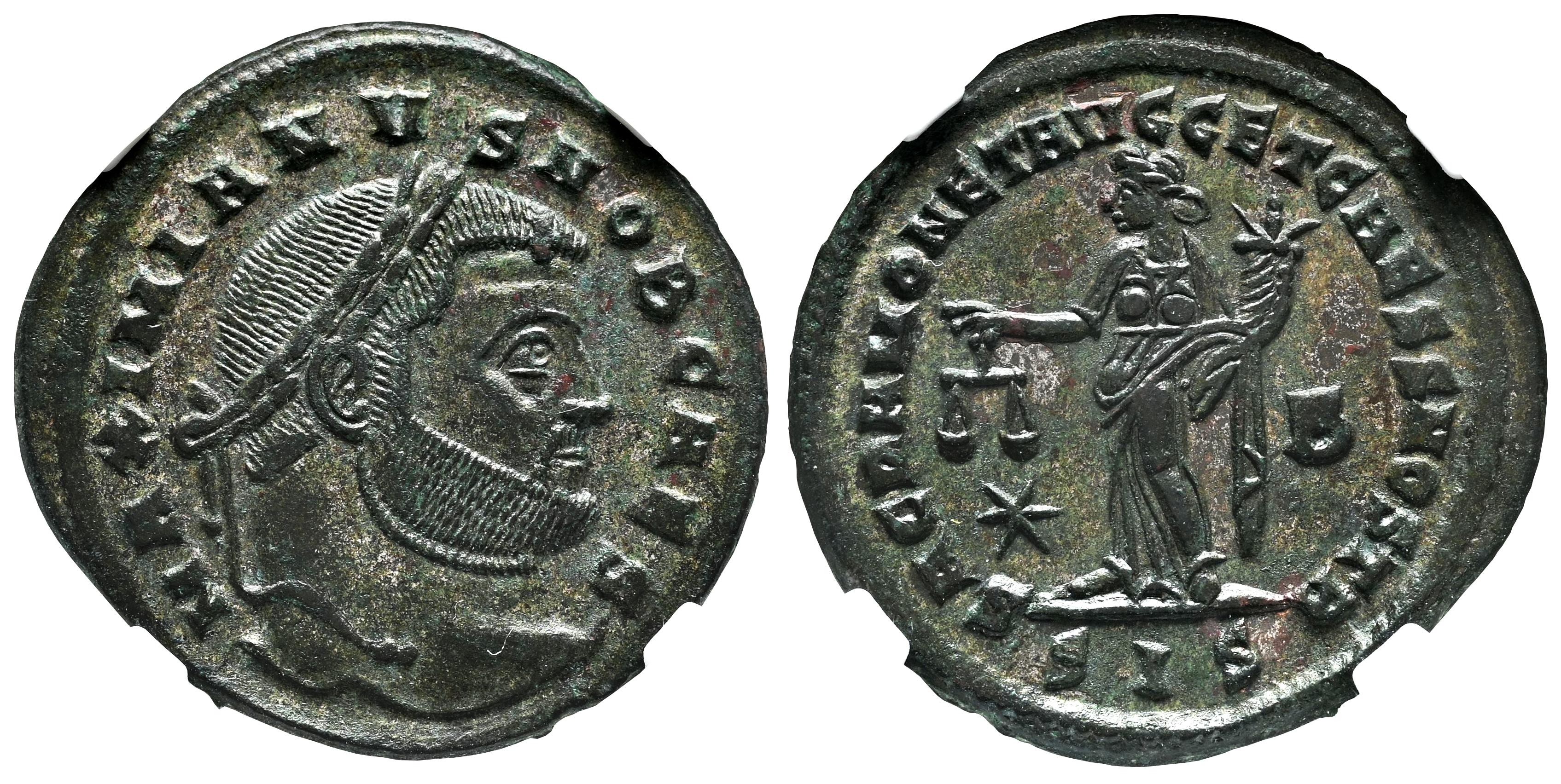 Galerio. Follis. 302 d.C. Siscia. (Ric-IV 137b). Anv.: MAXIMIANVS NOB CAES. Cabeza laureada a la derecha. Rev.: SACRA MONET AVGG ET CAESS NOSTR. Moneta de pie a la izquierda, sosteniendo una balanza y una cornucopia, estrella B sobre campos; SIS en el exergo. Ve. Encapsulada por NGC como AU. NGC-AU. Est...100,00.