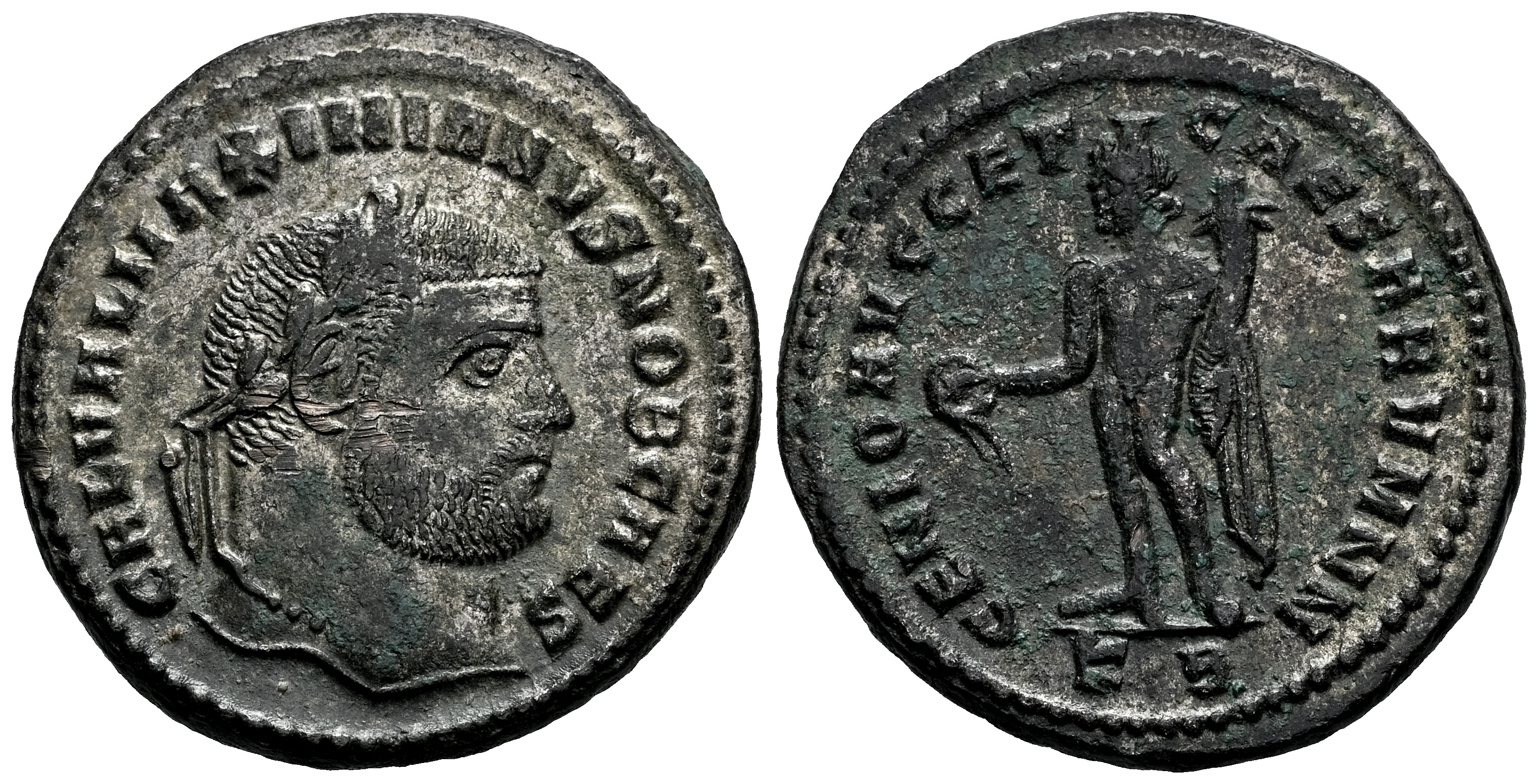Maximino II. Follis. 305-306 d.C. Cyzicus. (Ric-VI 20b). Anv.: GAL VAL MAXIMINVS NOB CAES. Cabeza laureada a derecha. Rev.: GENIO AVGG ET CAESARVM NN. Genio, con modius en la cabeza, de pie a izquierda, sosteniendo una cornucopia y una patera, de la que mana licor; KB en el exergo. Ae. 10,86 g. MBC+. Est...50,00.
