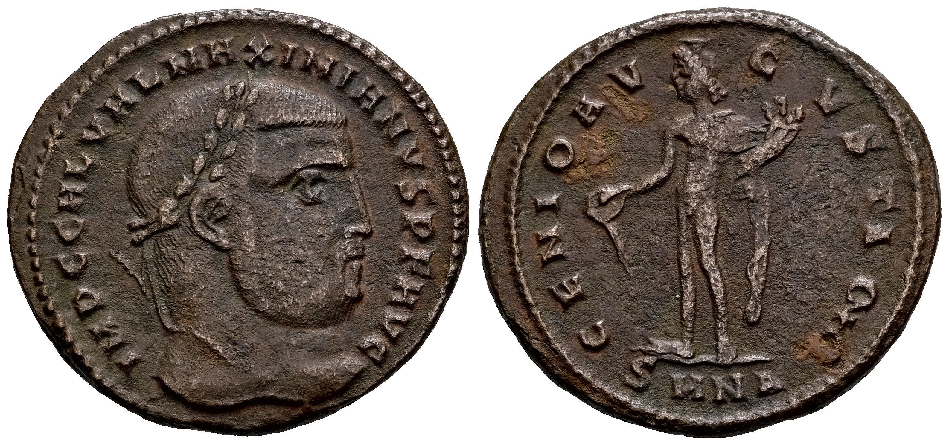 Maximino II. Follis. 310-311 d.C. Nicomedia. (Ric-66c). Anv.: IMP C GAL VAL MAXIMINVS P F AVG. Cabeza laureada a derecha. Rev.: GENIO CAESARIS CMH. Genio de pie a la izquierda, sosteniendo una patera y una cornucopia; SMNA en el exergo. Ag. 7,60 g. MBC-. Est...45,00.