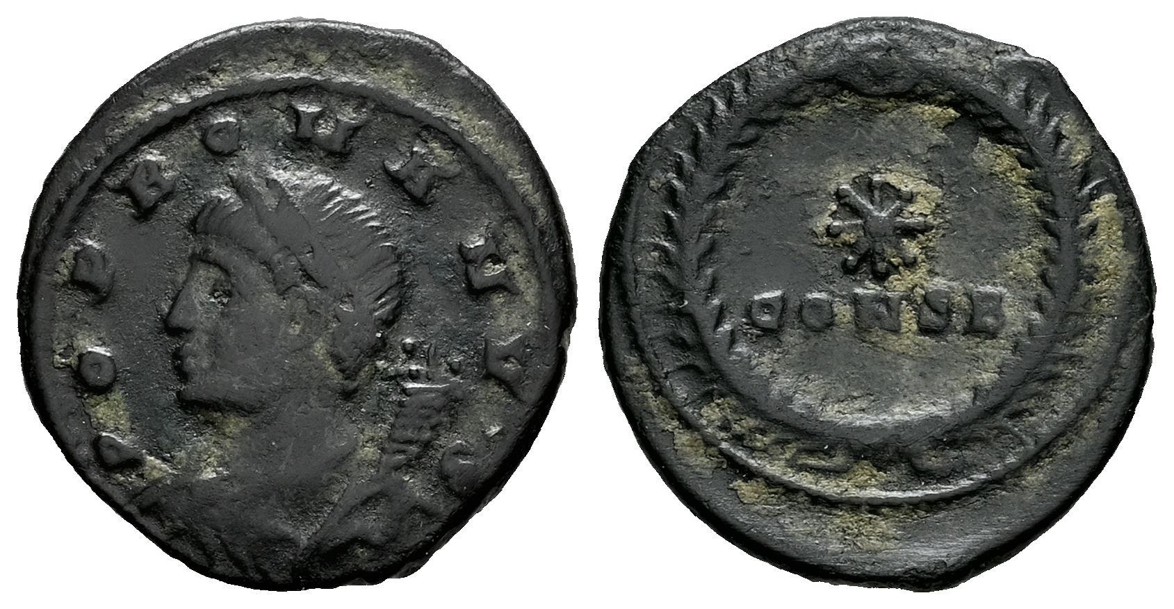 Constantino I. 1/2 follis. 330 d.C. Constantinopla. (Ric-VIII 22). Anv.: POP ROMANVS. Busto laureado y drapeado a la izquierda; cornucopia en el hombro. Rev.: Estrella sobre CONSB; todo dentro de una corona. Ae. 1,31 g. MBC/MBC+. Est...30,00.