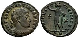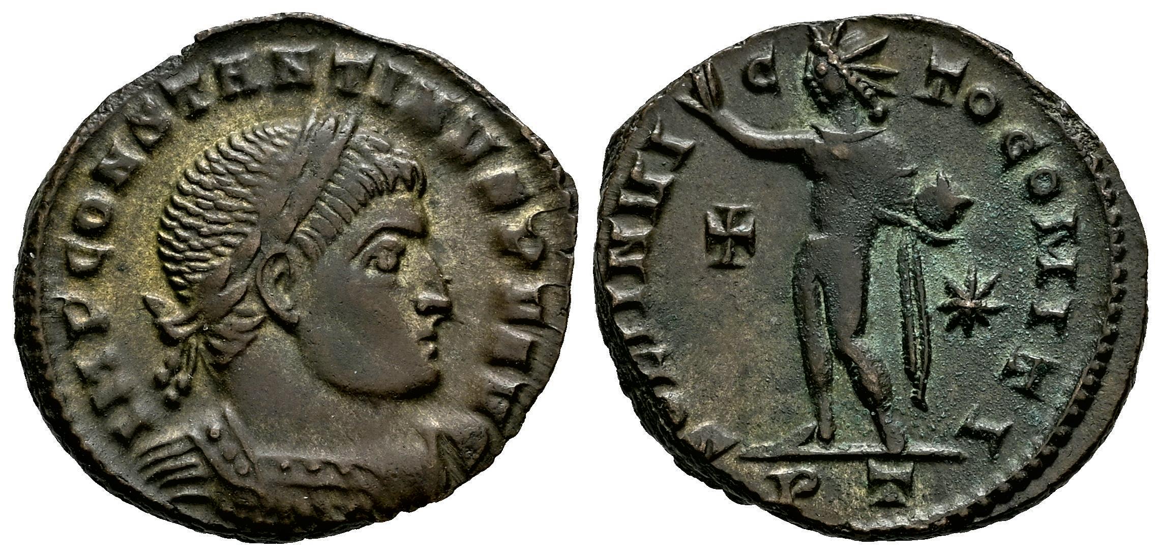 Constantino I. Follis. 316 d.C. Ticinum. (Ric-VII 45). Anv.: IMP CONSTANTINVS P F AVG. Busto laureado y con coraza a la derecha. Rev.: SOLI INVI-C-TO COMITI. Sol en pie de frente, mirando a la izquierda,Desnudo salvo por la clámide, levantando la mano derecha en señal de saludo y sosteniendo un globo con la izquierda; PT en exergo, + y estrella en el campo. Ae. 3,28 g. EBC-/MBC+. Est...35,00.