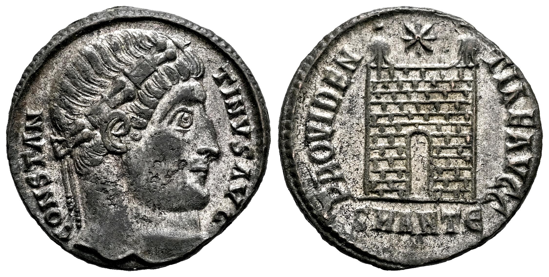 Constantino I. Follis. 325-326 d.C. Antioquía. (Ric-VII 71). Anv.: CONSTANTINVS AVG. Cabeza con diadema a la derecha. Rev.: PROVIDENTIAE AVGG. Puerta de campamento, sin puertas, punto en la entrada y dos almenas; estrella arriba, SMANTЄ en exergo. Ae. 3,63 g. Restos de plateado. EBC+. Est...50,00.