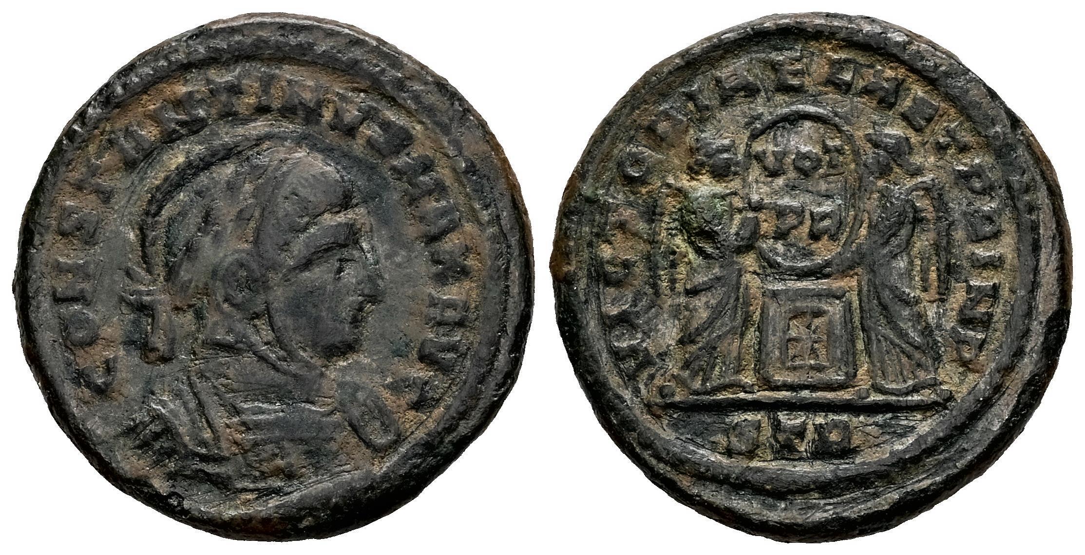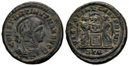 Constantino I. Follis. 319 d.C. Treveri. (Ric-213). Anv.: IMP CONSTANTINVS MAX AVG. Busto con casco y coraza a derecha. Rev.: VICTORIAE LAETAE PRINC PERP, Dos victorias en pie sosteniendo escudo con inscripción VOT / PR en dos lineas, sobre una columna con estrella. En exergo STR. Ae. 4,00 g. MBC+. Est...45,00.