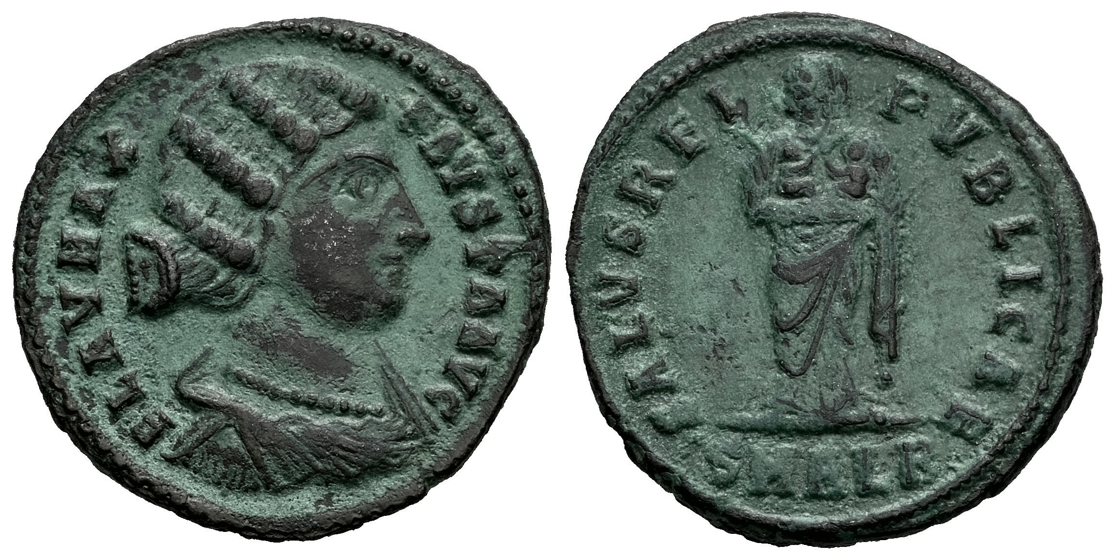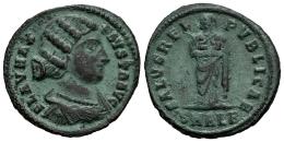 Fausta. Follis. 325-326 d.C. Alejandría. (Ric-VII 40). Anv.: FLAV MAX FAVSTA AVG. Busto drapeado a derecha con cabello ondulado. Rev.: SPES REIPVBLICAE. Salus velada en pie a la izquierda, en sus brazos dos niños; SMALB en exergo. Ae. 3,13 g. Ex Tauler & Fau 113 (28/06/2022), lote 1237. MBC. Est...65,00.