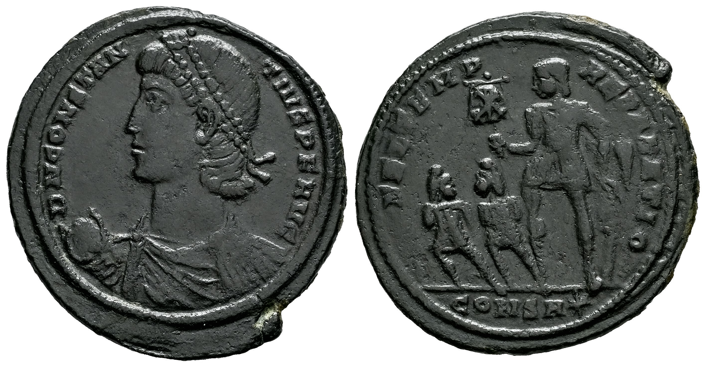 Constantino II. Centenional. 348-351 d.C. Constantinopla. (Ric-84). Anv.: D N CONSTAN-TIVS P F AVG. Busto con diadema de perlas, drapeado y con coraza, mirando hacia la izquierda, sosteniendo un globo terráqueo en su mano derecha. Rev.: FEL TEMP REPARATIO. Constancio II, con atuendo militar, de pie de frente, con la cabeza hacia la izquierda, sosteniendo el labarum en su mano derecha y colocando la izquierda sobre un escudo colocado en el suelo; ante él, a la izquierda, dos cautivos; CONSA✱ en el exergo. Ae. 5,61 g. MBC+/MBC. Est...30,00.