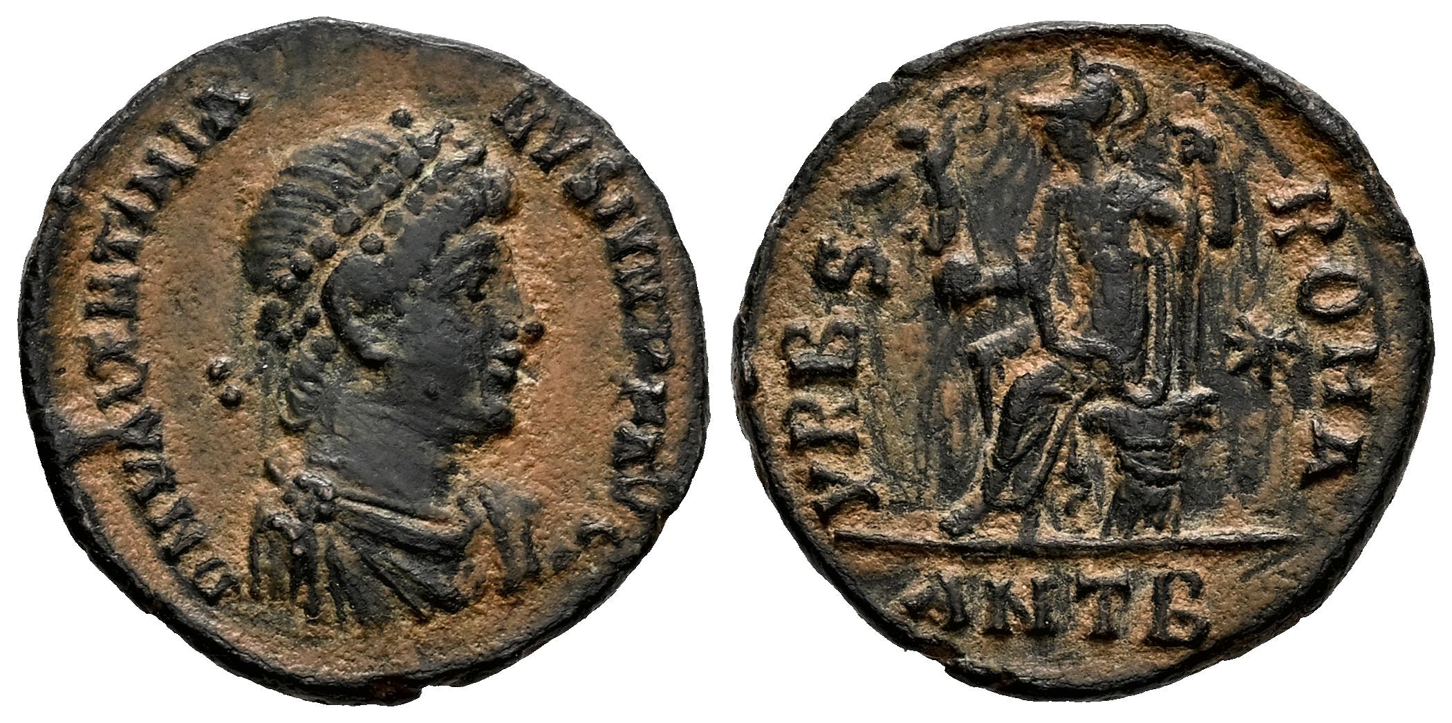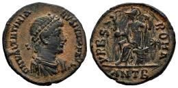 Valentiniano II. Centenional. 378-392 d.C. Antioquía. (Ric-X 51.1). (LRBC-2870). Anv.: D N VALENTINIANVS IVN P F AVG, Busto con diadema de perlas, drapeado y con coraza a la derecha. Rev.: VRBS ROMA, Roma sedente a la izquierd sobre coraza, portando Victoriasobre globo y lanza; estrella en el campo derecho, ANTB en exergo. Ae. 2,53 g. EBC-. Est...45,00.