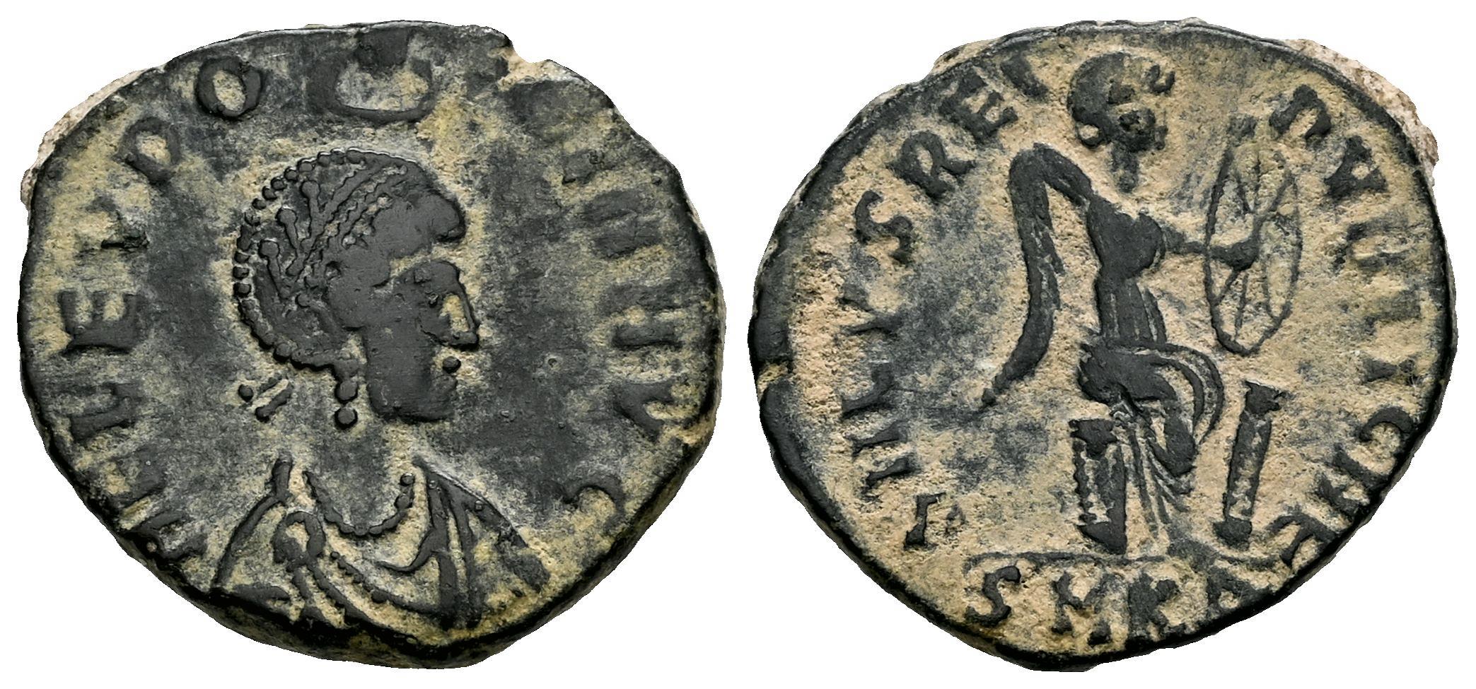 Aelia Eudoxia. 1/2 maiorina. 401-403 d.C. Cyzicus. (Ric-X 103). (LRBC-2589). Anv.: AEL EVDOXIA AVG. Busto con diadema y drapeado a la derecha, siendo coronado por la mano de Dios arriba. Rev.: SALVS REIPVBLICAE. Victoria sedente a la derecha sobre coraza, sosteniendo escudo inscrito con cristograma; SMKA en exergo. Ae. 2,54 g. MBC. Est...80,00.