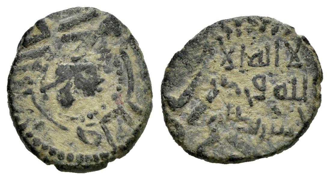 Periodo de los gobernadores. Felús. Al-Andalus. (Frochoso-XIVa). (Walker-Th12). Ae. 1,54 g. Tipo guerrero, cabeza masculina con casco a la derecha. Acuñado sobre otro Felús tipo Frochoso IIa. MBC. Est...50,00.