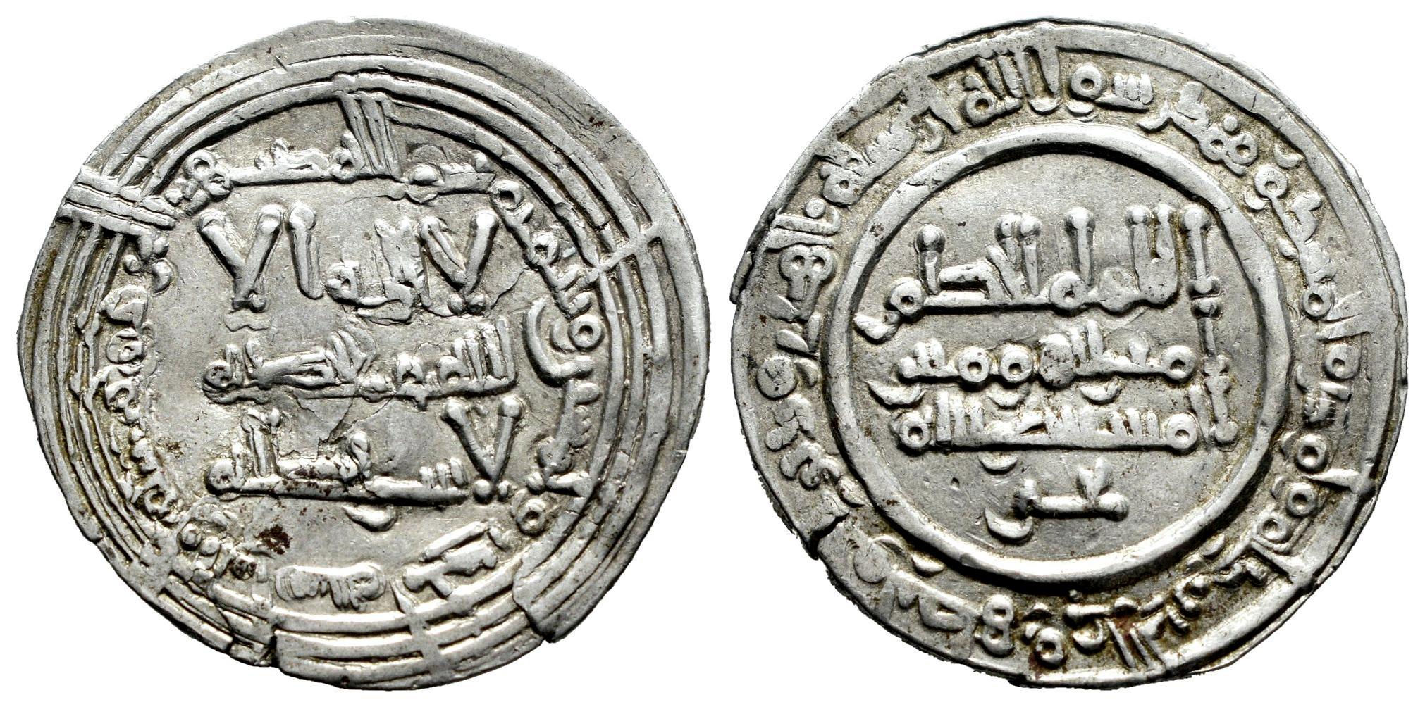 Califato de Córdoba. Al-Hakam II. Dirham. 351 H. Madinat al-Zahra. (Vives-448). (Frochoso-14). Ag. 3,66 g. Citando a Yahya en IIA. Defecto de metal en anverso. Muy rara. MBC+/EBC-. Est...80,00.