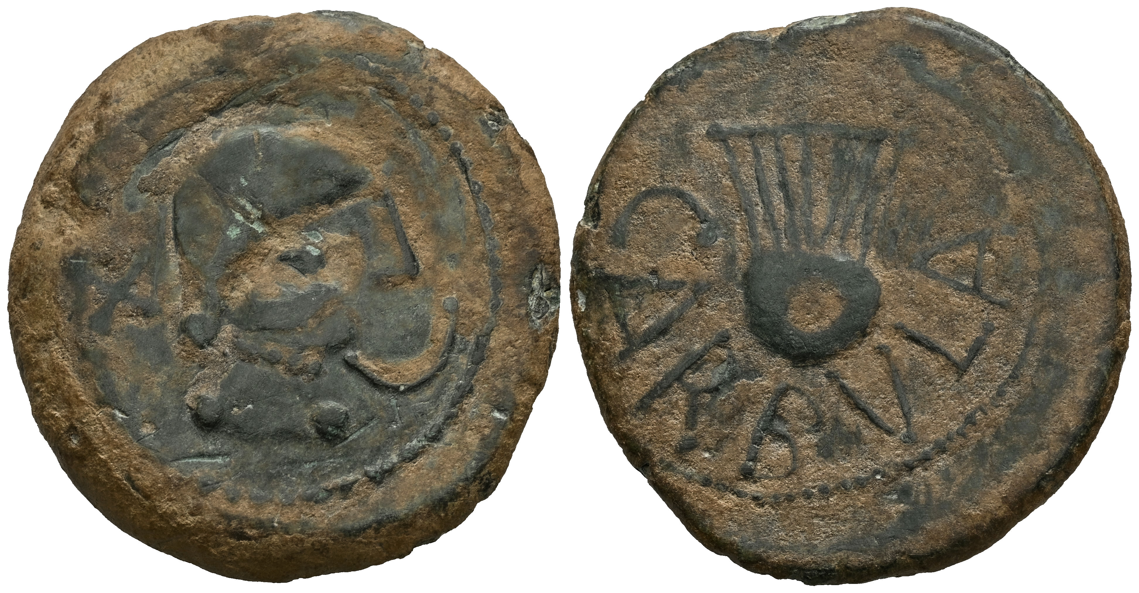 Carbula. As. 80 a.C. Almodóvar del Río (Córdoba). (Abh-440 var.). (MIB-210/2 var.). (Acip-2312 var.). Anv.: Cabeza de Apolo a derecha, detrás letra ibérica TA y delante ¿serpiente?. Rev.: Lira y leyenda CARBVLA. Ae. 20,38 g. MBC-. Est...100,00.