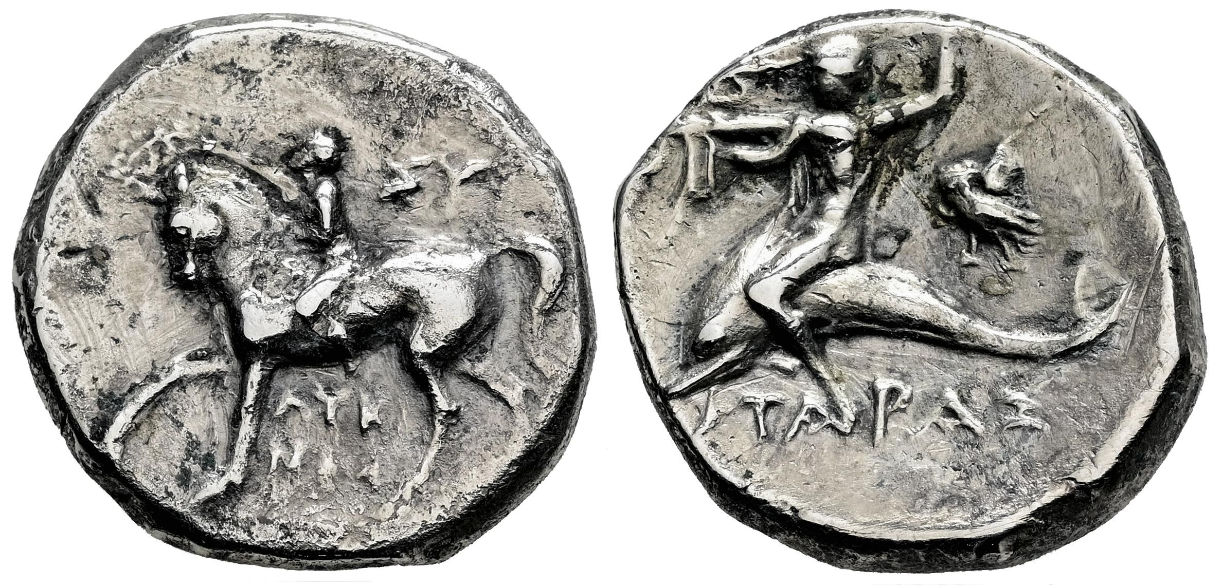 Calabria. Tarentum. Nomos. 272-240 a.C. Magistrados Sy- y Lykinos. (Vlasto-836/41). (HN Italy-1025). (SNG Ans-1165). Anv.: Joven desnudo a caballo a la izquierda, coronando a un caballo que levanta la pata delantera izquierda; ΣY arriba, ΛΥKΙ-ΝΟΣ en dos líneas abajo. Rev.: Taras a horcajadas sobre un delfín a la izquierda, blandiendo un tridente, con clámides alrededor de los hombros y el brazo izquierdo; búho en pie a la izquierda en el campo derecho, TAPAΣ abajo. Ag. 6,06 g. Limpiada. Rayitas. Ex Áureo & Calicó 396 (18/10/2022), lote 3006. MBC-/MBC. Est...150,00.