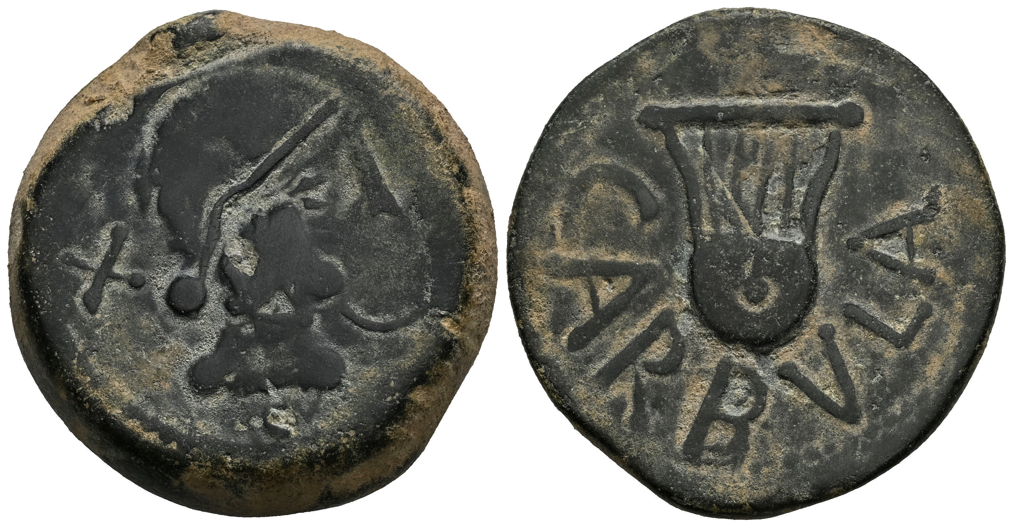 Carbula. As. 80 a.C. Almodóvar del Río (Córdoba). (Abh-440 var.). (MIB-210/2 var.). (Acip-2312 var.). Anv.: Cabeza de Apolo a derecha, detrás letra ibérica TA y delante ¿serpiente?. Rev.: Lira y leyenda CARBVLA. Ae. 21,38 g. MBC-/MBC. Est...120,00.