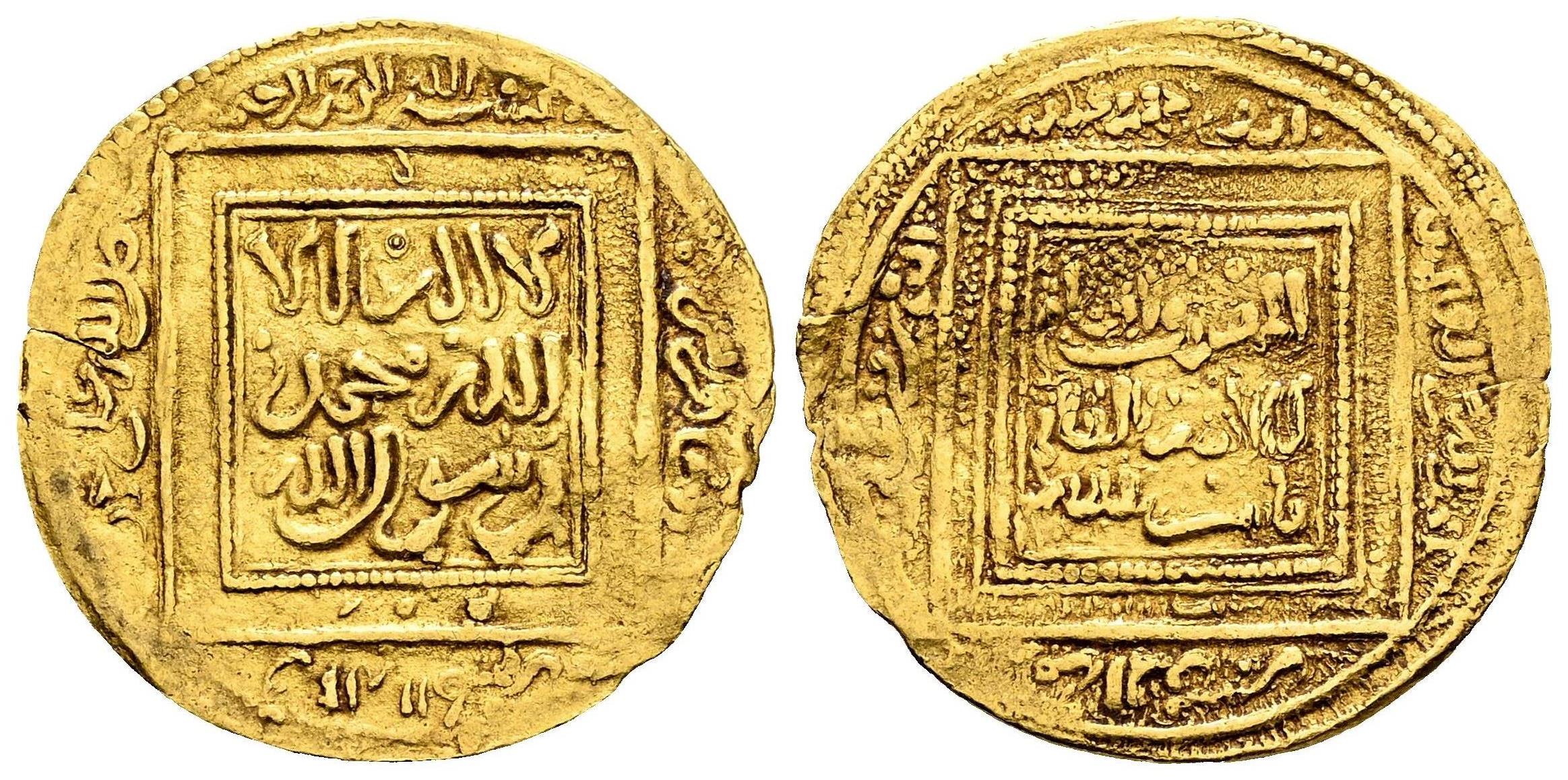 Almohades. Abd Al-Mu`min. 1/2 dinar. 524-558 H. (Vives-2050 var.). (Hazard-460 var.). Au. 2,29 g. Desdoblada. Raro tipo. MBC+/MBC. Est...600,00.