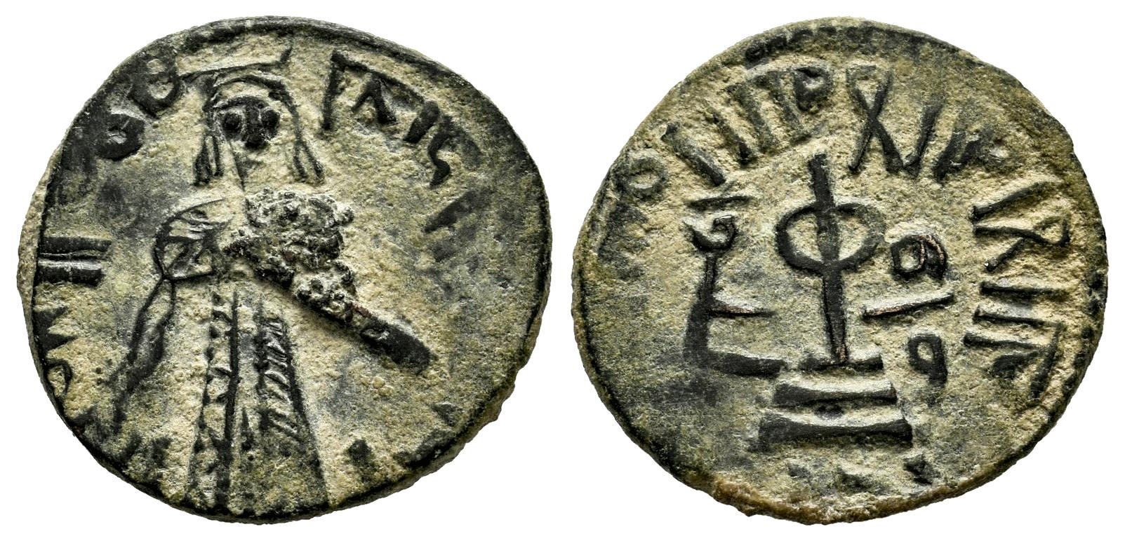 Califato Omeya. 'Abd al-Malik ibn Marwan. Felús. 74-80 H = 693/4-699/700 d.C. Tanukh. (DOCAB-129). (Album-656). Anv.: Califa en pie, de frente, con barba, colocando la mano derecha en la empuñadura de su espada y un látigo colgando de su codo derecho; alrededor, la inscripción «J li' abd Allah' abd al-Malik Amir al-Mu'minin'» («Para el siervo de Alá, Abd al-Malik, Comandante de los Creyentes» en cúfico). Rev.: Cruz transformada sobre tres escalones; en el campo izquierdo, ceca bi-tanukh («en Tanukh» en cúfico); en el campo derecho, wāf («con todo su peso» en cúfico); alrededor, parte del primer Kalima que dice «la ilaha illa Allah wahdahu Muhammad rasul Allah» («No hay más Dios que Alá; Mahoma es el mensajero de Alá»). Ae. 2,82 g. MBC+. Est...90,00.