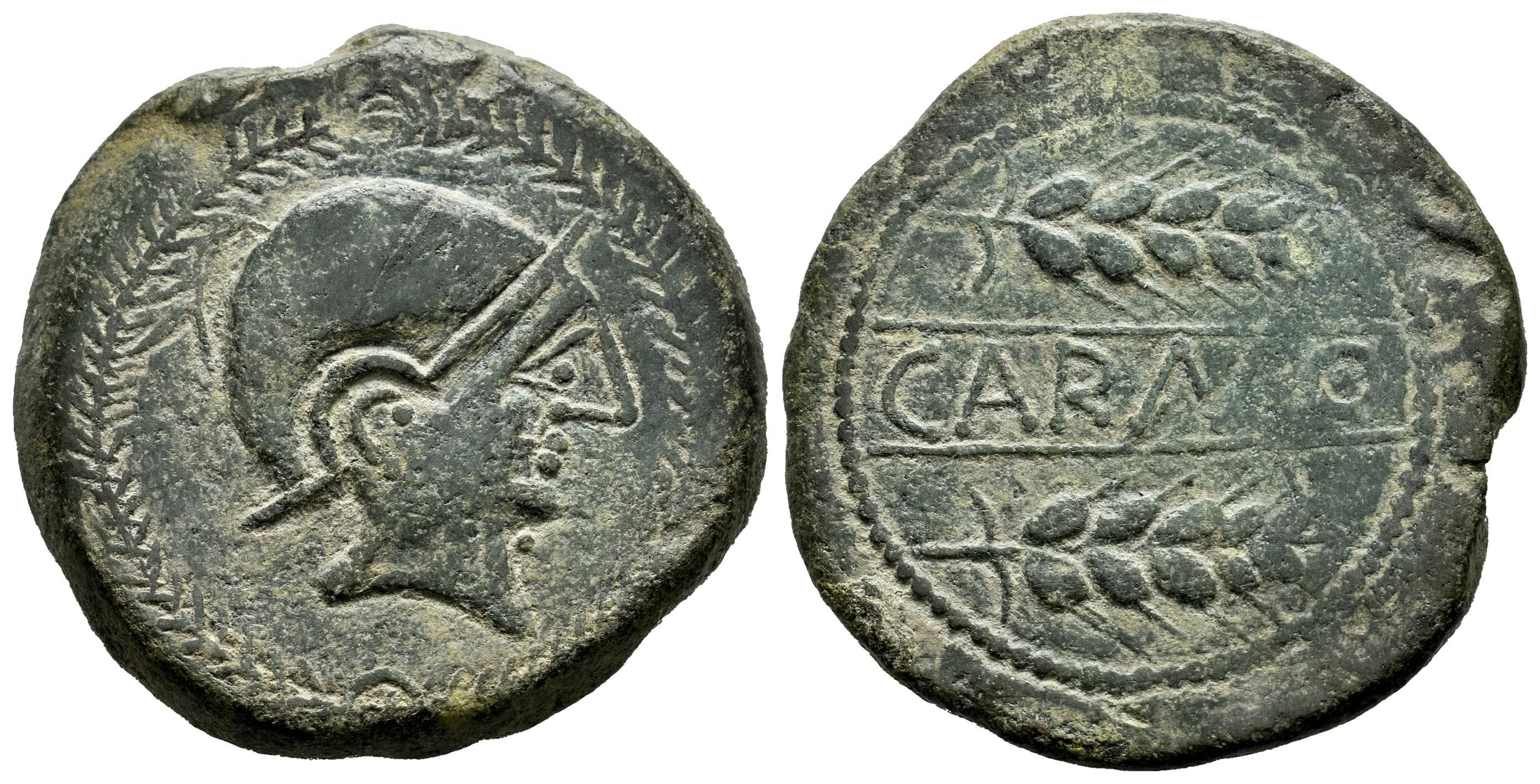 Carmo. As. 80 a.C. Carmona (Sevilla). (Abh-454 var.). (MIB-198/01b). Anv.: Dentro de láurea, cabeza masculina a derecha. Rev.: Dos espigas a derecha, entre ambas CARM⊙. Ae. 29,10 g. Atractiva. MBC+. Est...200,00.
