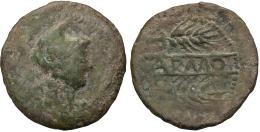 Carmo. As. 80 a.C. Carmona (Sevilla). (Abh-457). (MIB-198/09). (Acip-2386). Anv.: Cabeza femenina con casco con cimera. Rev.: Dos espigas a derecha, entre ambas CARMO. Ae. 19,39 g. Rara. BC-/MBC-. Est...90,00.