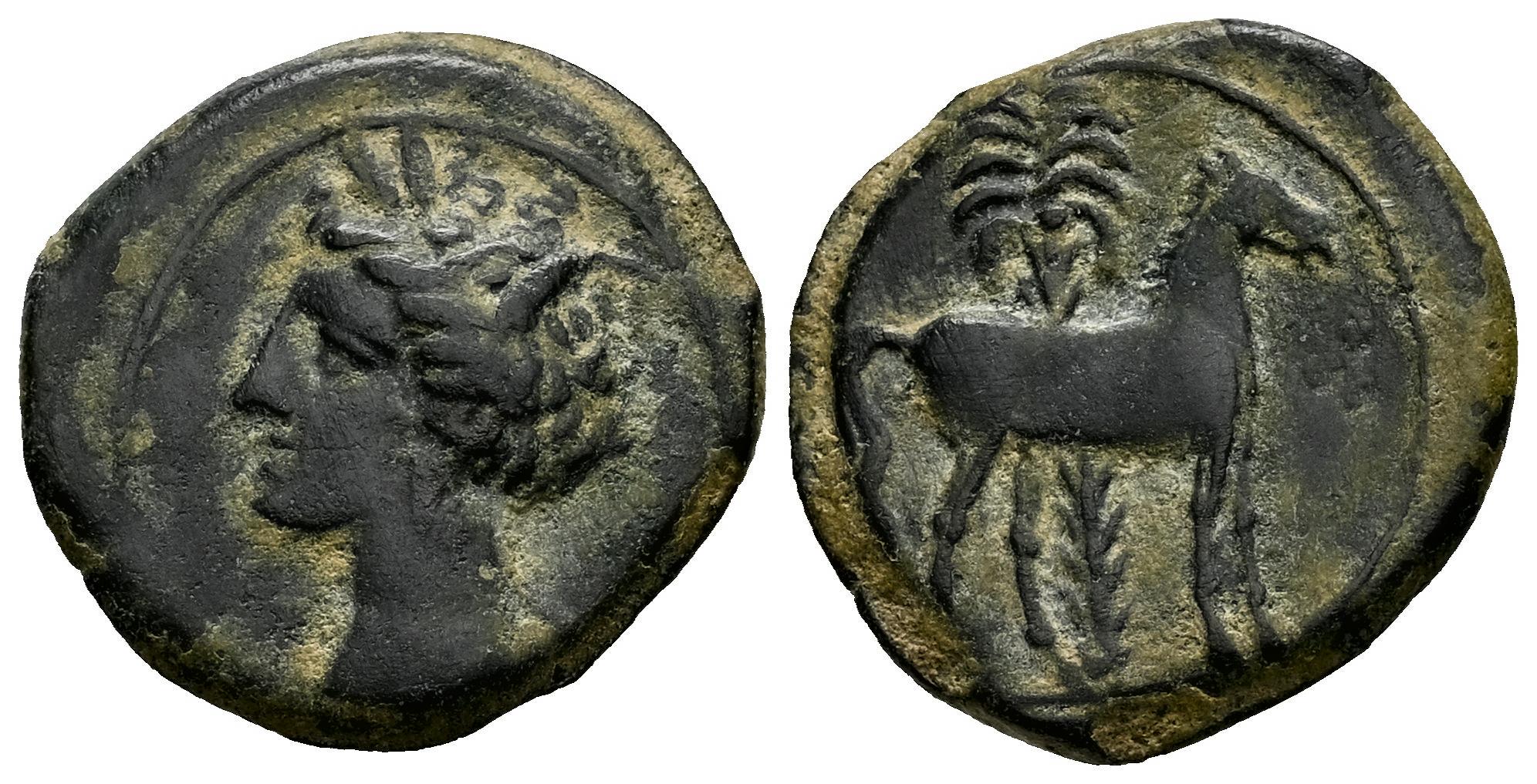 Acuñaciones Hispano-Cartaginesas. 1/2 calco. 220-215 a.C. Cartagena (Murcia). (Abh-507). (MAA-18). (Sng Cop-109/19). Anv.: Cabeza de Tanit a izquierda. Rev.: Caballo parado a derecha, detrás palmera. Ae. 2,66 g. MBC+. Est...100,00.
