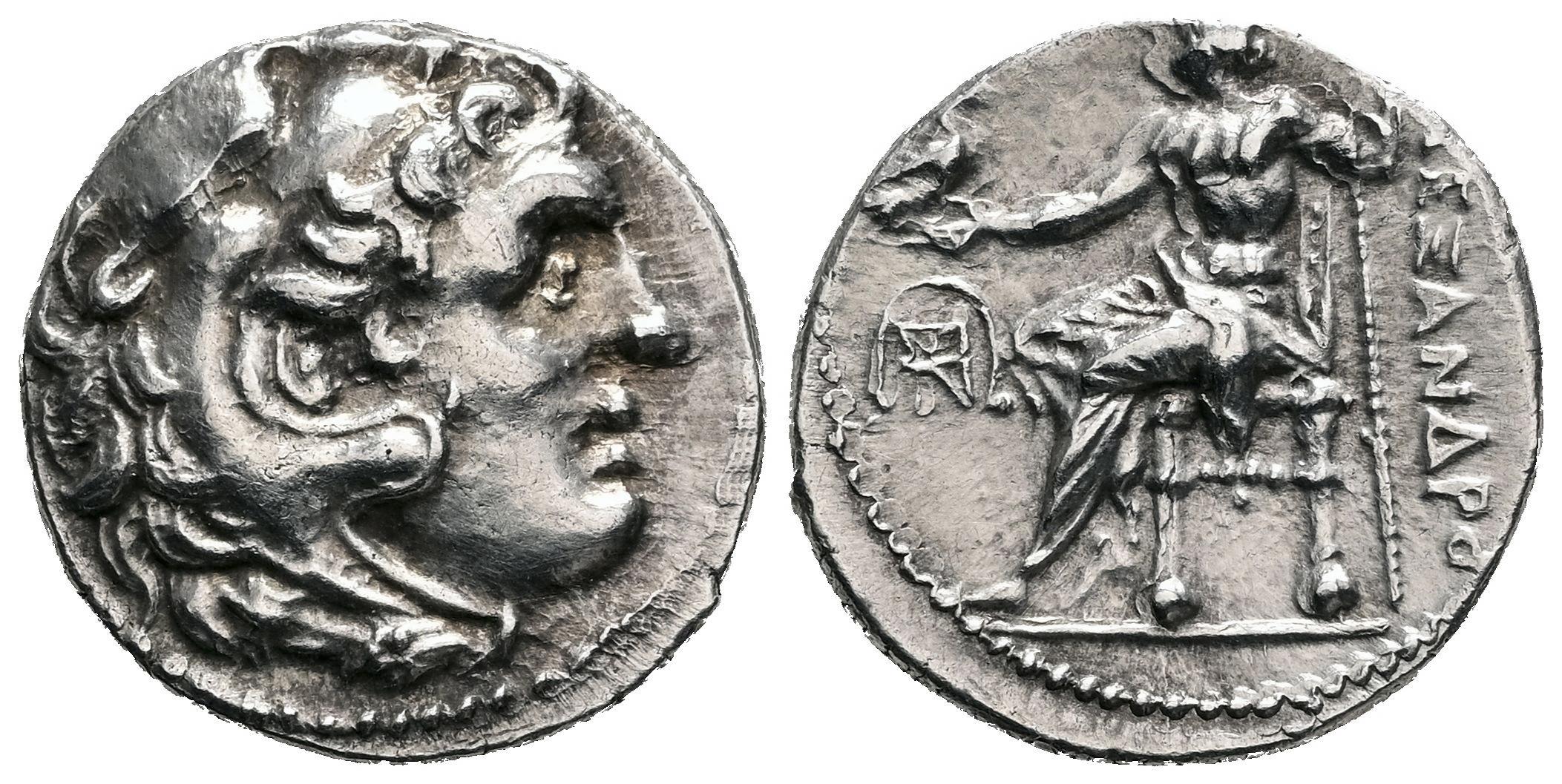 Karia. Mylasa. Dracma. 300-280 a.C. En nombre y tipos de Alejandro III de Macedonia. (Price-2488). (Müller-1269). Anv.: Cabeza de Heracles a la derecha, con tocado de piel de león. Rev.: Zeus Aëtophoros sedente a la izquierda, sosteniendo un cetro; AΛEΞANΔPOY a la derecha, monograma en el campo izquierdo. Ag. 4,15 g. Rara. EBC-. Est...200,00.