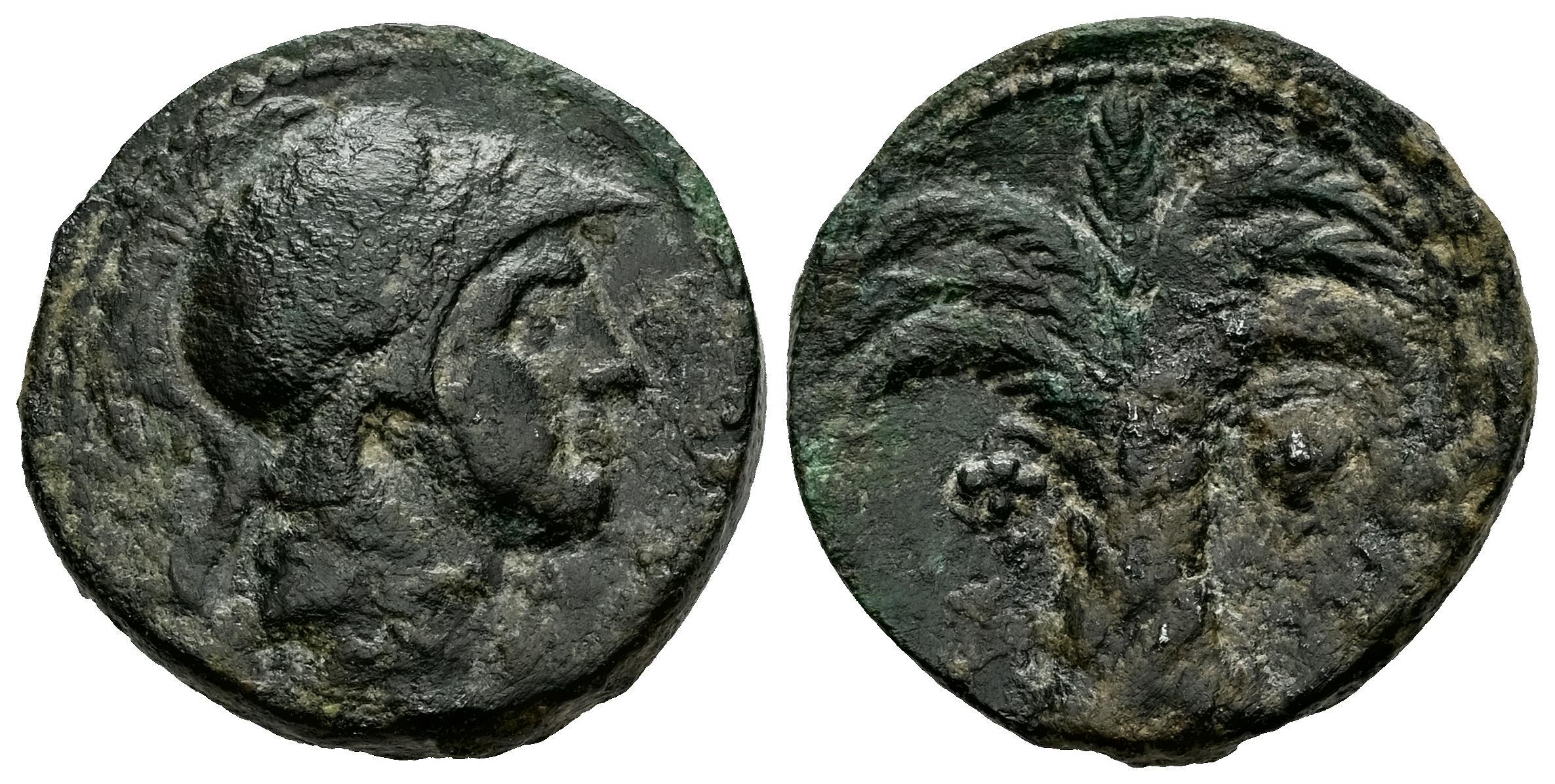 Acuñaciones Hispano-Cartaginesas. Calco. 220-215 a.C. Cartagena (Murcia). (Abh-518). (Acip-581 R3). (Sng Cop-292). Anv.: Cabeza de Ares a la derecha. Rev.: Palmera. Ae. 5,19 g. Ex Soler & Llach 1123 (01/12/2021), lote 32. MBC-. Est...80,00.