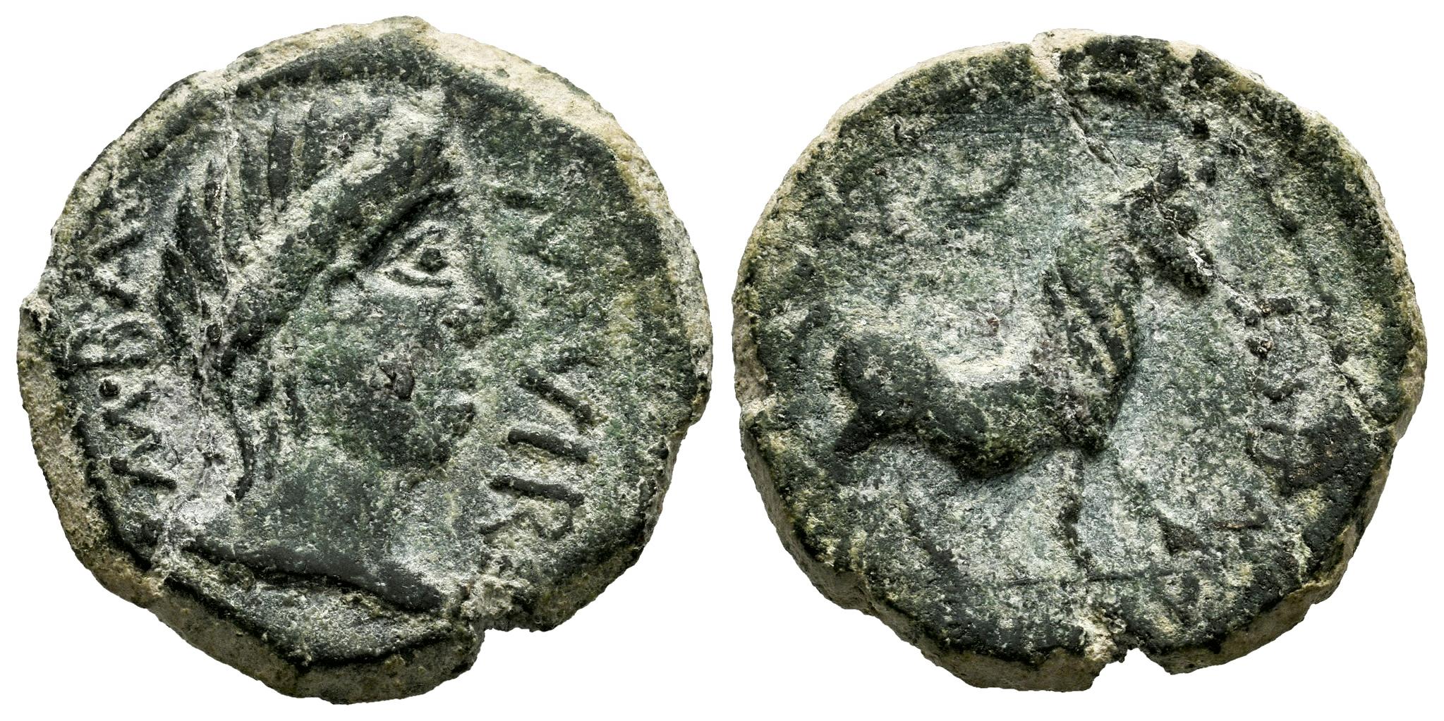 Kastilo-Castulo. Semis. 180 a.C. Cazlona (Jaén). (Abh-No cita). (MIB-No cita). (Acip-No cita). Anv.: Cabeza masculina laureada a derecha, delante M·BA - M. VIR(IL). Rev.: Toro a derecha, encima creciente, delante VOS·F; en exergo leyenda incierta. Ae. 10,13 g. El ejemplar que ofrecemos muestra el anverso del raro tipo (MIB-157/67; Acip-2173), sin embargo, su reverso, el toro, exhibe una posición distinta y en movimiento, a diferencia del tipo mencionado que es muy rígido. Se puede observar la leyenda delante del toro VOST·F? y en el exergo quedan restos de una leyenda que resulta difícil de interpretar. Aparentemente inédito. MBC/MBC-. Est...200,00.