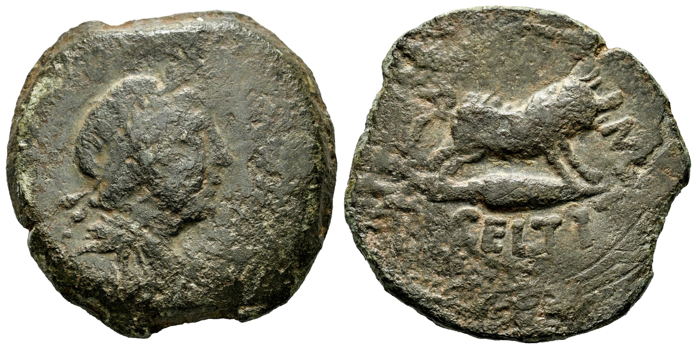 Celtitan. As. 50 a.C. Peñaflor (Sevilla). (Abh-822). (MIB-211/1). (Acip-2427). Anv.: Cabeza laureada a derecha. Rev.: Jabalí a derecha, sobre punta de ¿lanza?, debajo leyenda latina CELTIT(A)N. Ae. 27,18 g. Rara. BC+/MBC-. Est...200,00.