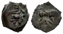 Ebusus. 1/8 calco. 200-100 a.C. Ibiza. (Abh-924). (MIB-16/21a). (Acip-706). Anv.: Bes con faldellín sosteniendo martillo y serpiente. Rev.: Toro embistiendo a derecha. Ae. 1,00 g. MBC+. Est...50,00.