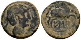 Eso. As. 120-20 a.C. Isona (Lleida). (Abh-1291). Anv.: Cabeza masculina a derecha, delante dos delfines, detrás letra ibérica KE. Rev.: Jinete con palma a derecha, debajo leyenda ibérica ESO. Ae. 8,16 g. Muy escasa. BC/BC+. Est...100,00.