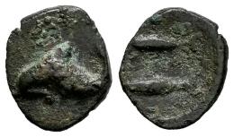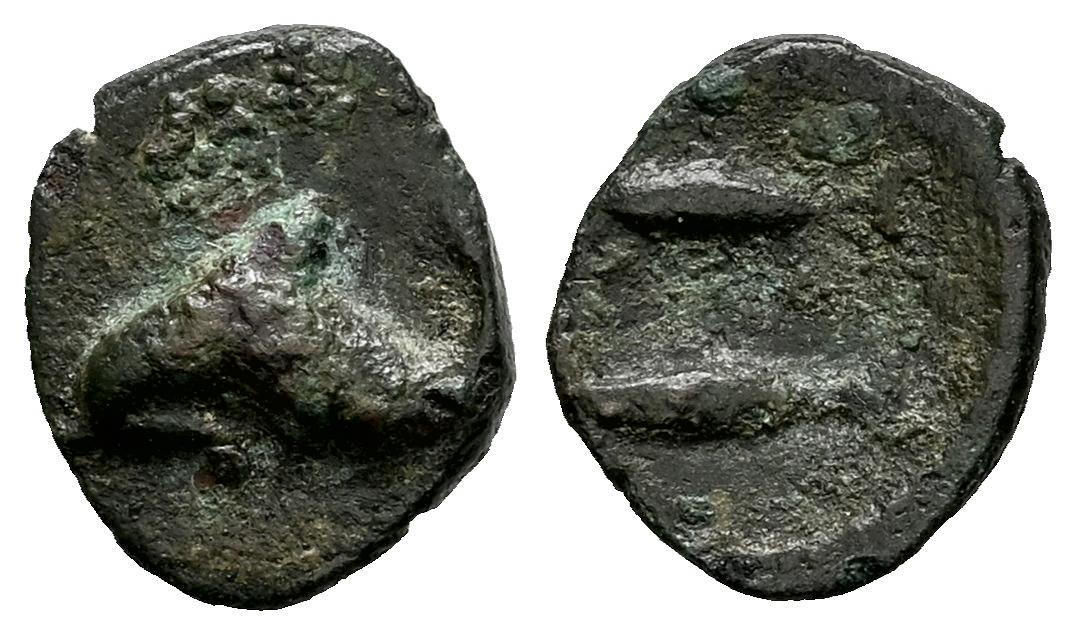 Gades-Gadir. 1/8 calco. 300-200 a.C. Cádiz. (Abh-1305). (MIB-9/24). (Acip-646). Anv.: Delfín a izquierda. Rev.: Dos atunes a izquierda. Ae. 0,48 g. Muy rara. MBC. Est...120,00.