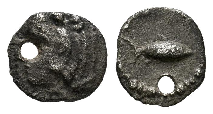 Gades-Gadir. Hemióbolo. 200-100 a.C. Cádiz. (Abh-1310). (MIB-9/09). (Acip-636). Anv.: Cabeza de Melkart a izquierda. Rev.: Atún a derecha. Ag. 0,36 g. Pátina original. Perforación. Rara. MBC-/MBC. Est...70,00.