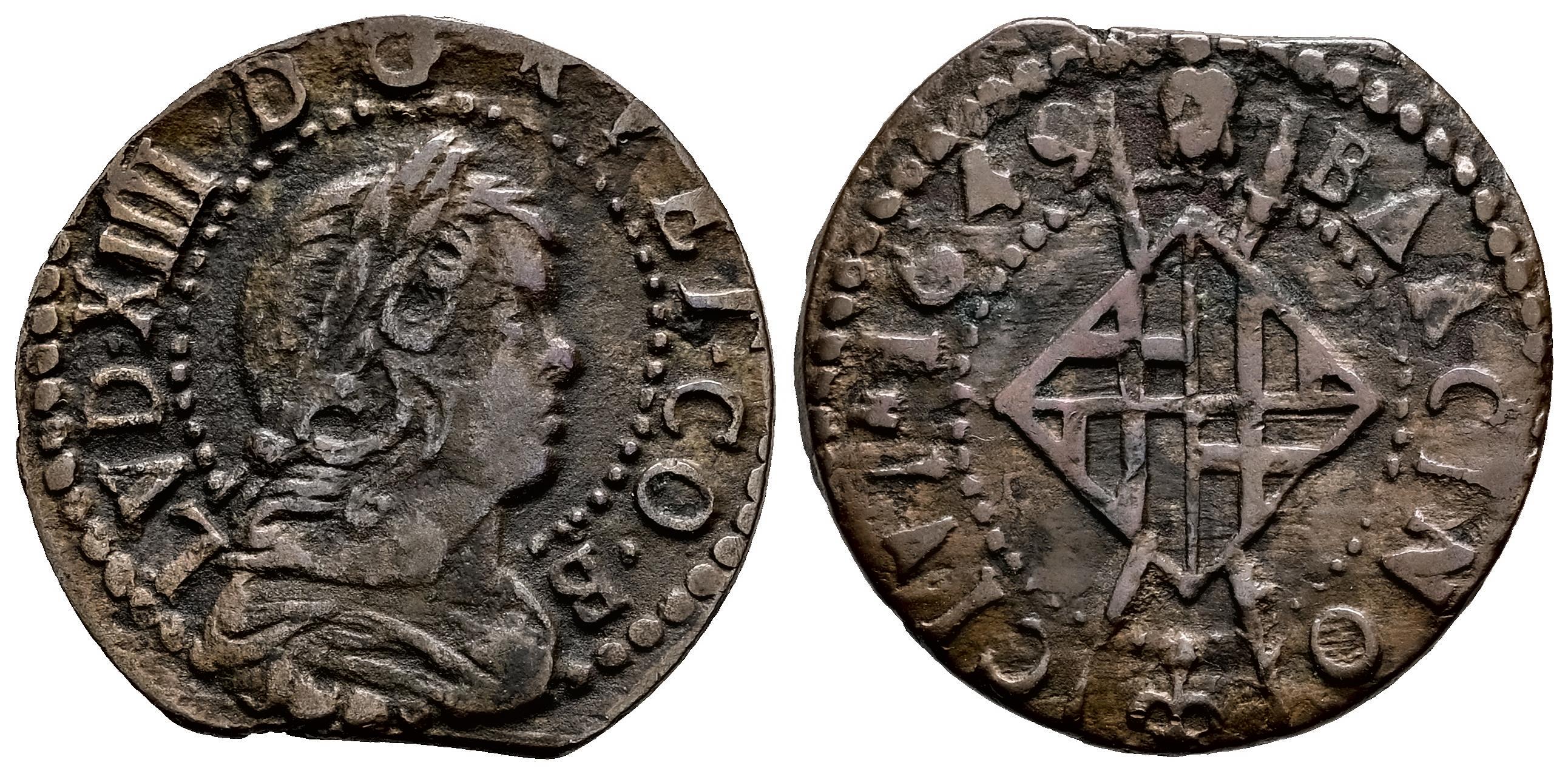 Felipe IV (1621-1665). Guerra de los Segadores. Seiseno. 1649. Barcelona. (Cal-53). (Cru C.G-4553e). Ae. 3,44 g. Busto de Luis XIV. Ex Tauler & Fau 94 (19/10/2021), lote 3483. MBC-. Est...30,00.