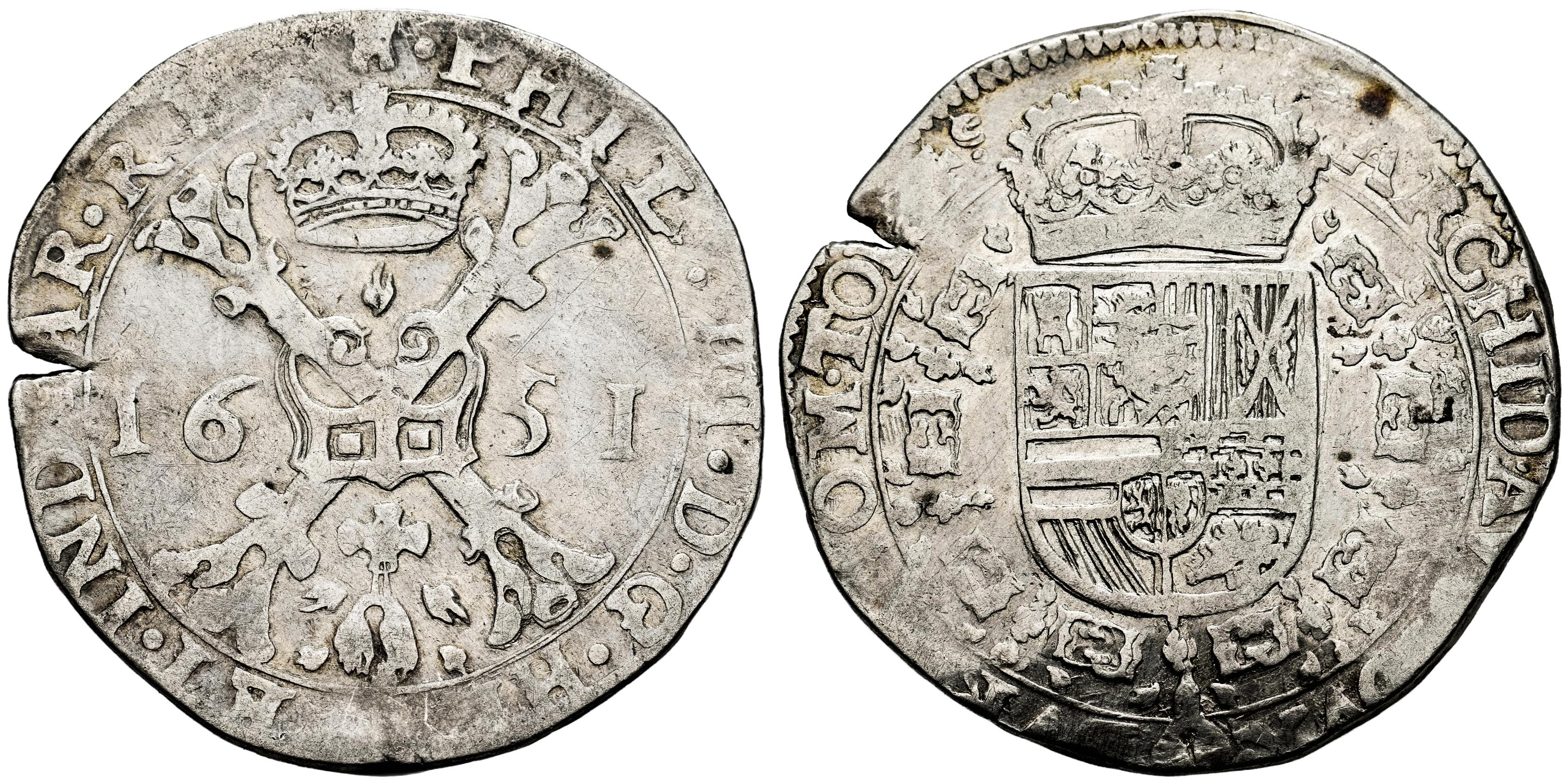 Felipe IV (1621-1665). 1 patagón. 1651. Tournai. (Tauler-2735). (Vti-1134). (Vanhoudt-645TO). Ag. 27,80 g. Rayitas superficiales. Limpiada. MBC. Est...180,00.