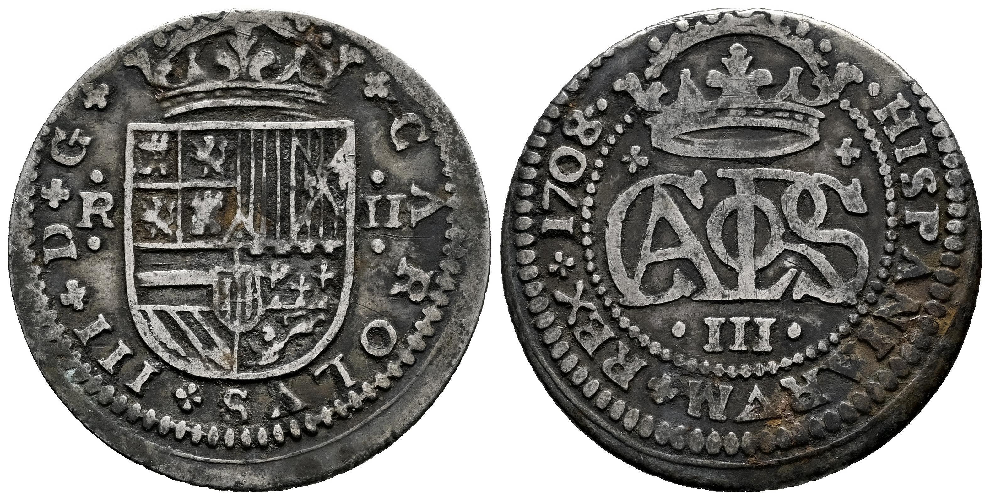 Carlos III, Pretendiente (1701-1714). 2 reales. 1708. Barcelona. (Cal-28). Ag. 4,43 g. Acuñación ligeramente desplazada. Leves oxidaciones. MBC-. Est...75,00.