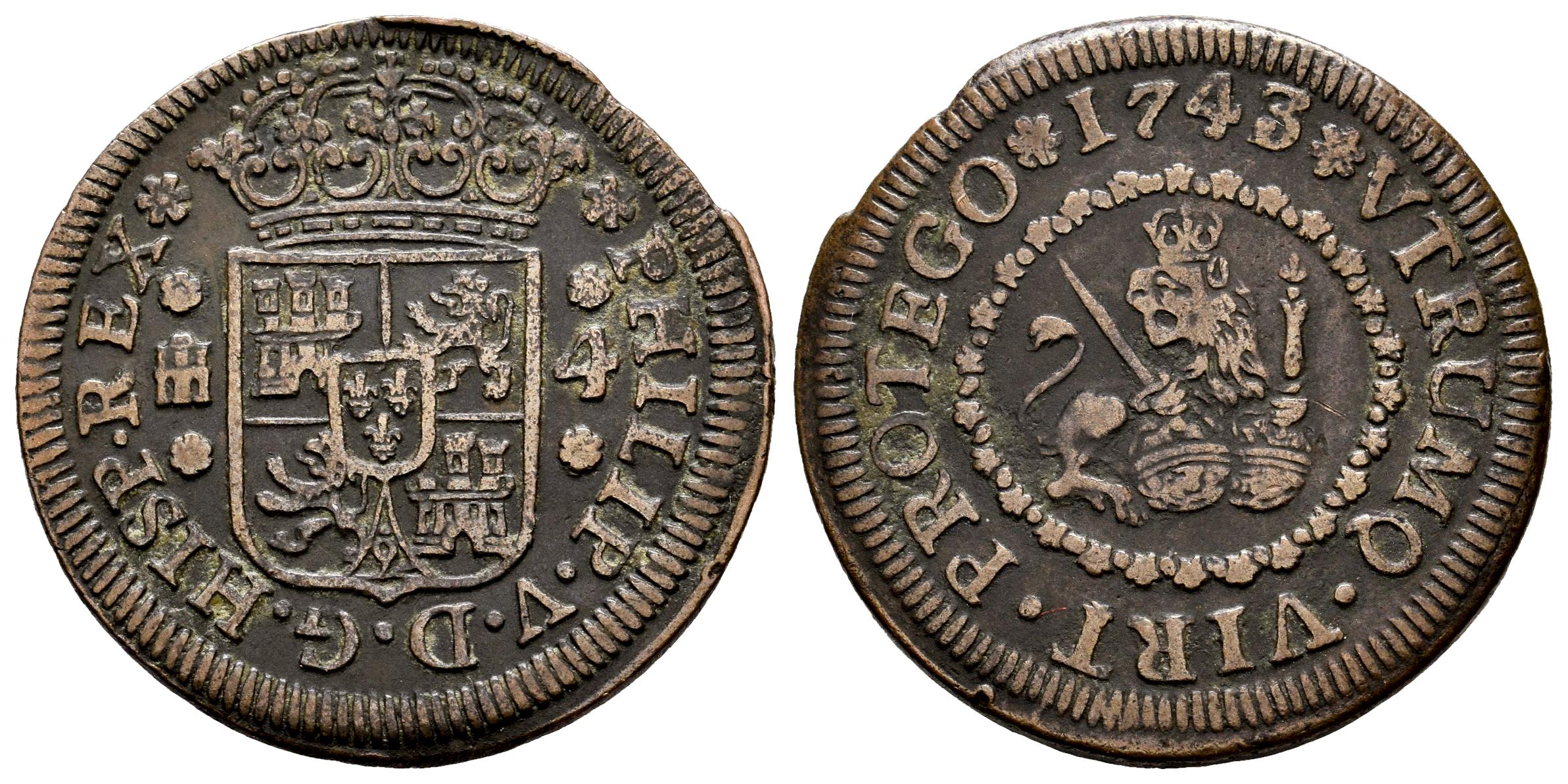 Felipe V (1700-1746). 4 maravedís. 1743. Segovia. (Cal-95). Ae. 6,26 g. Defecto de cospel. MBC-. Est...15,00.