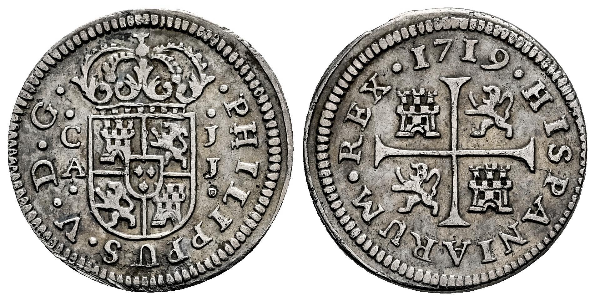Felipe V (1700-1746). 1/2 real. 1719. Cuenca. JJ. (Cal-105). Ag. 1,28 g. PHILIPPUS. MBC. Est...30,00.