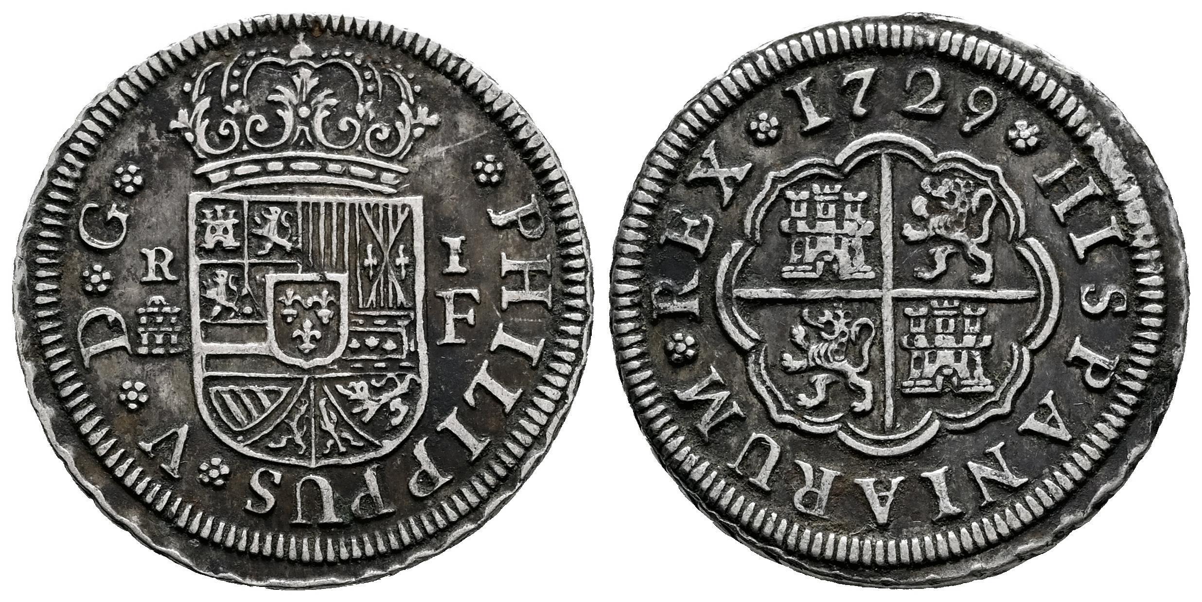 Felipe V (1700-1746). 1 real. 1729. Segovia. F. (Cal-630). Ag. 2,92 g. Ligera pátina. MBC+. Est...100,00.