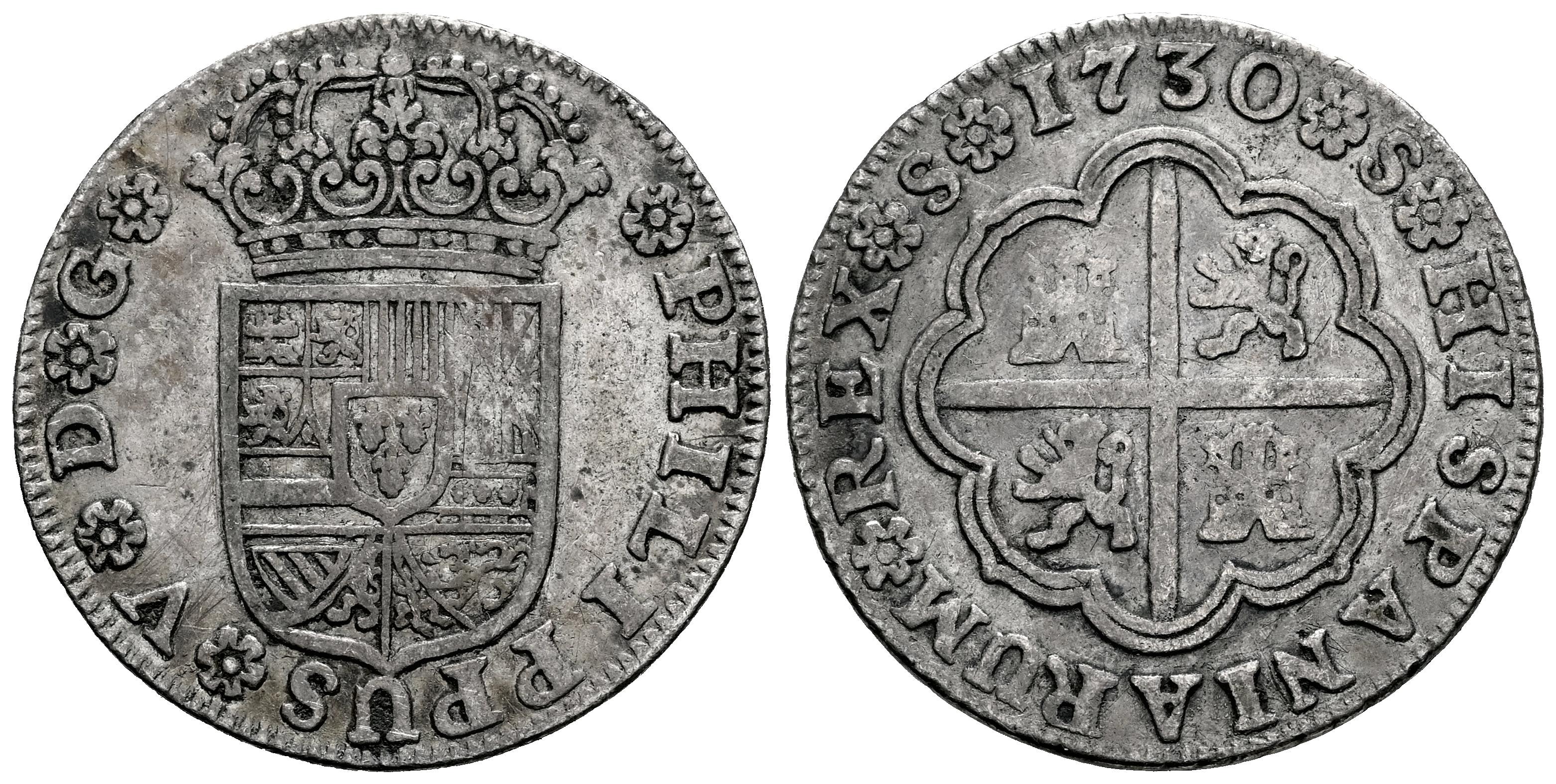 Felipe V (1700-1746). 2 reales. 1630. Sevilla. (Cal-986). Ag. 5,56 g. Sin marca de ceca ni ensayador. MBC-/BC+. Est...60,00.