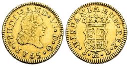 Fernando VI (1746-1759). 1/2 escudo. 1755. Madrid. JB. (Cal-558). Au. 1,74 g. Ex Áureo & Calicó 391 (01/06/2022), lote 1344. MBC/MBC+. Est...220,00.