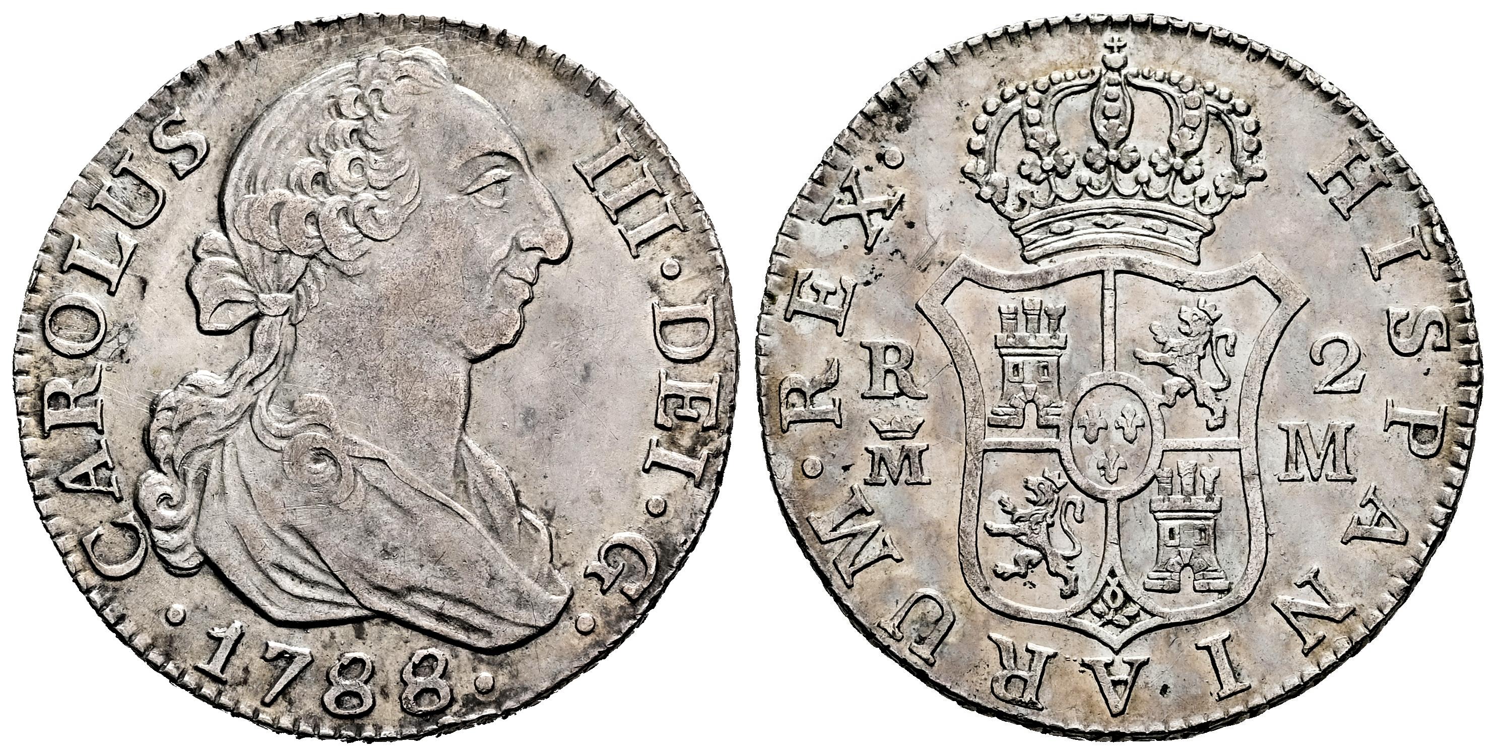 Carlos III (1759-1788). 2 reales. 1788. Madrid. M. (Cal-640). Ag. 5,97 g. Leves restos de brillo original y ligero tono. EBC-. Est...160,00.