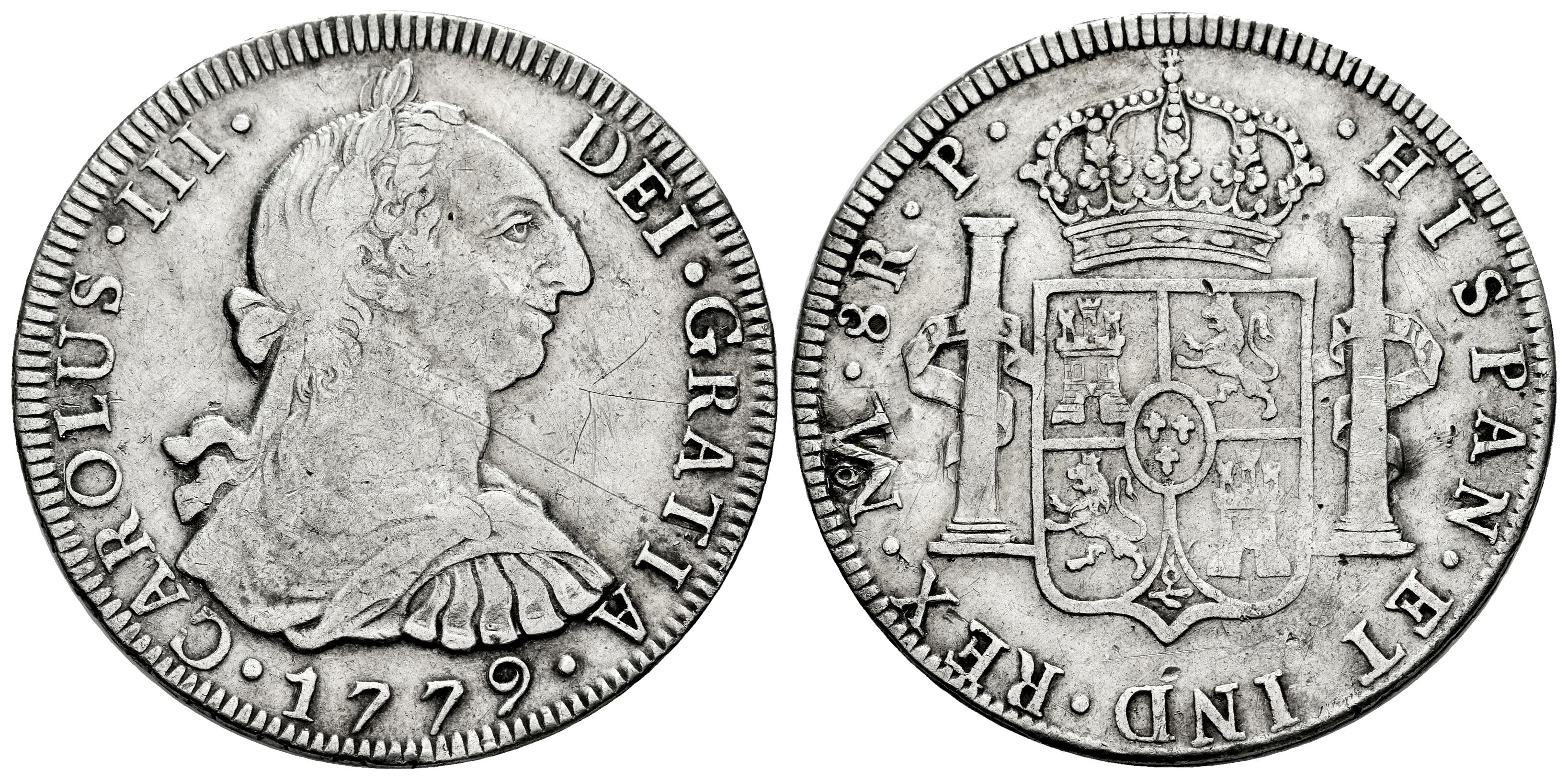 Carlos III (1759-1788). 8 reales. 1779. Guatemala. P. (Cal-1011 var.). Ag. 26,71 g. Marca de ceca "NG" regrabada como "Mo" de México. MBC+. Est...320,00.