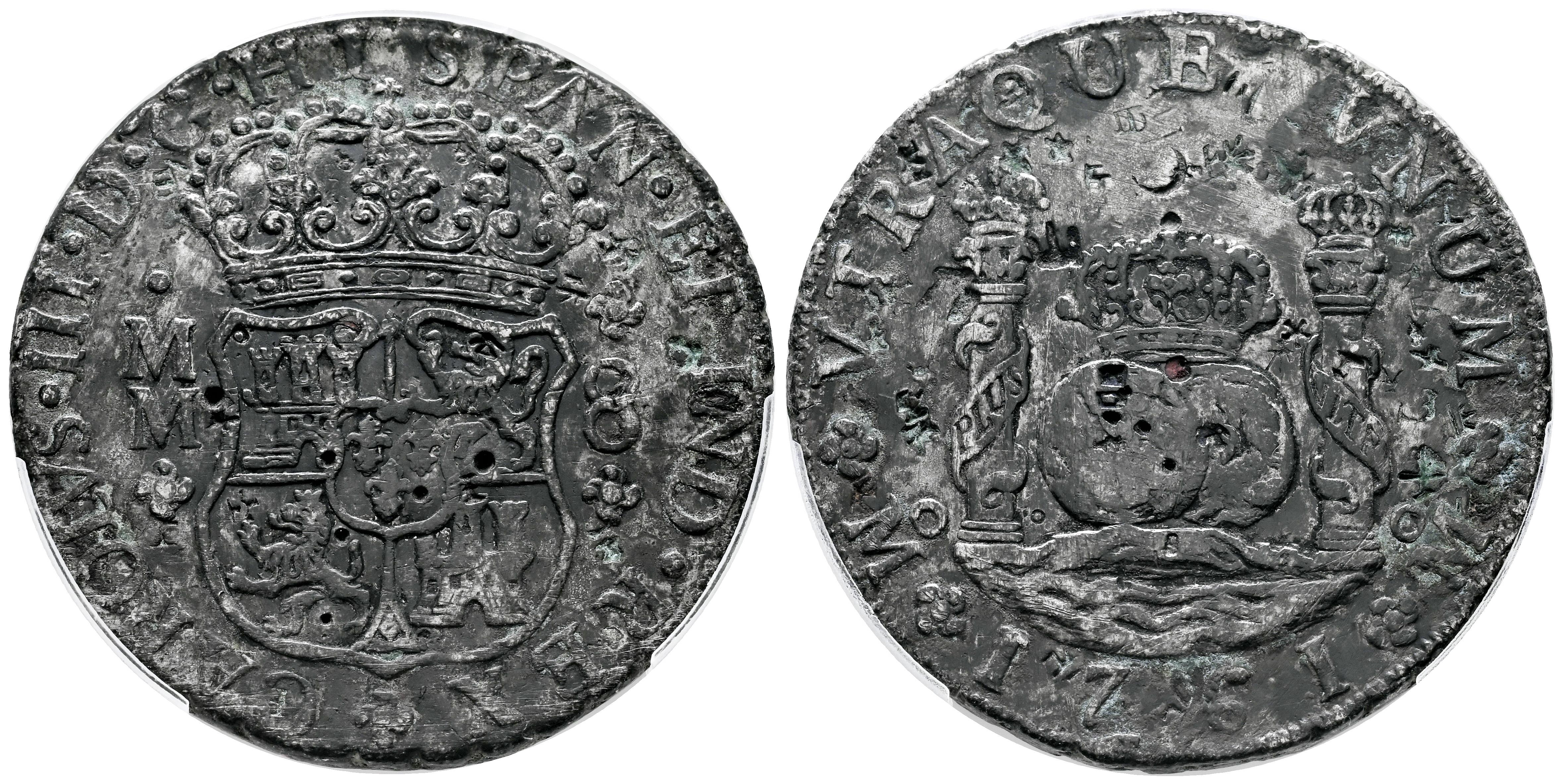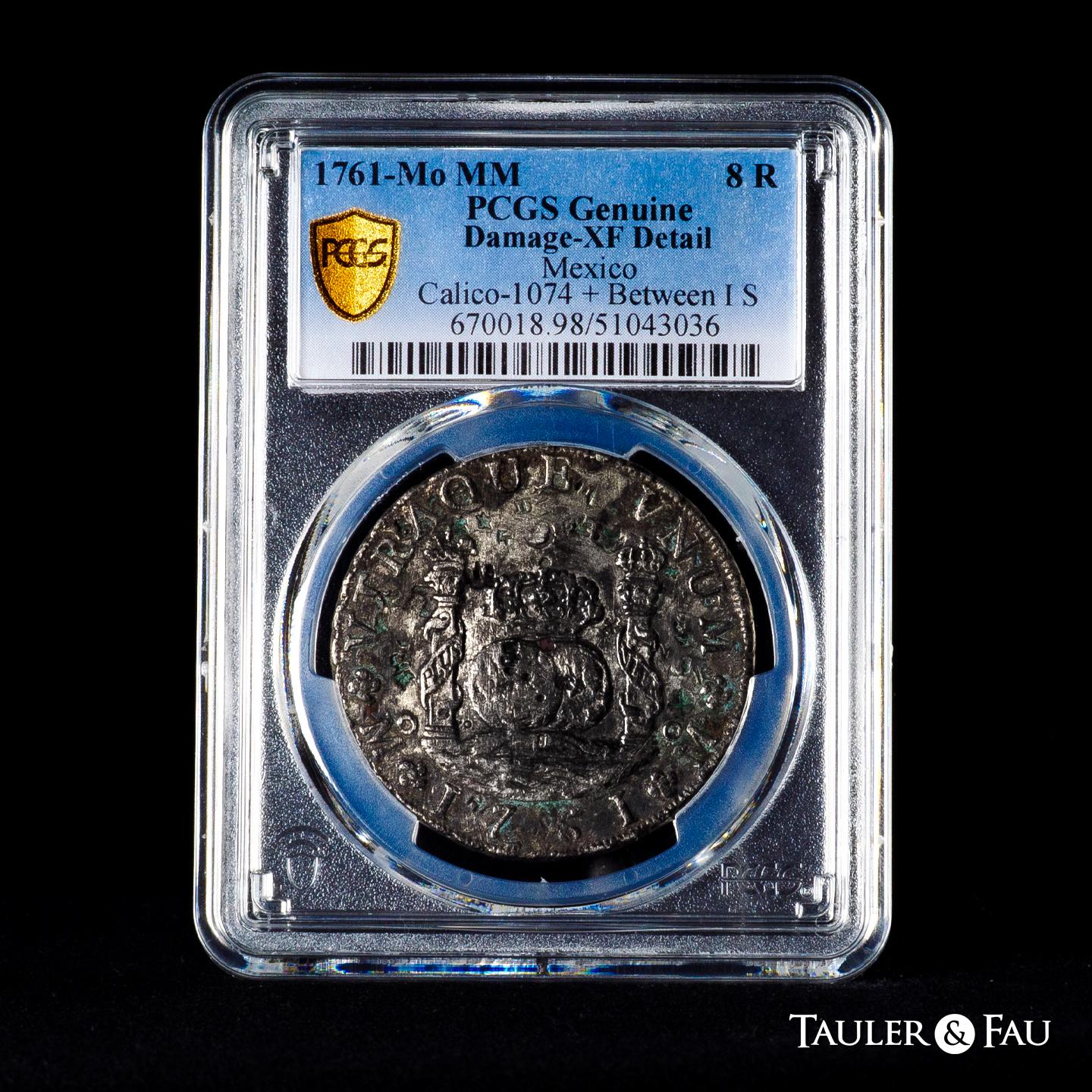 Carlos III (1759-1788). 8 reales. 1761. México. MM. (Cal-1074). Ag. Pequeños resellos orientales. Pátina. Encapsulada por PCGS como Genuine, Damage-XF Detail. Est...350,00.
