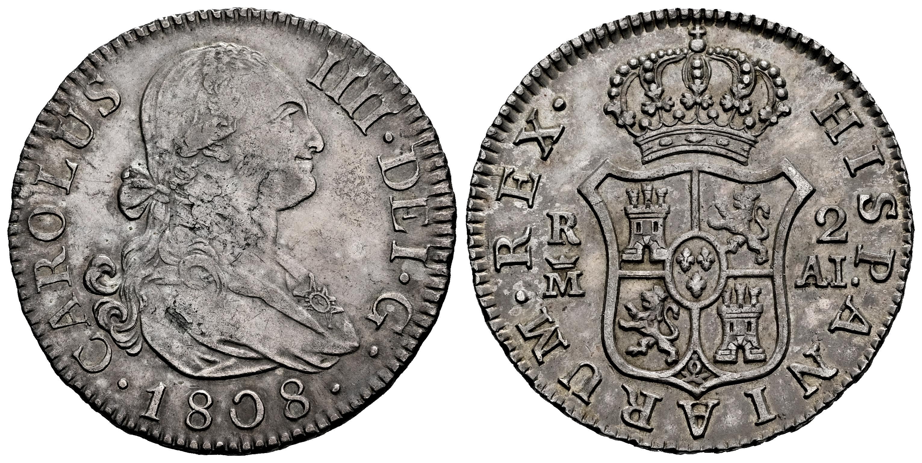 Carlos IV (1788-1808). 2 reales. 1808. Madrid. AI. (Cal-619). Ag. 5,85 g. Suave pátina con ligero tono. Mínimas hojas en anverso. Atractiva. MBC+. Est...80,00.